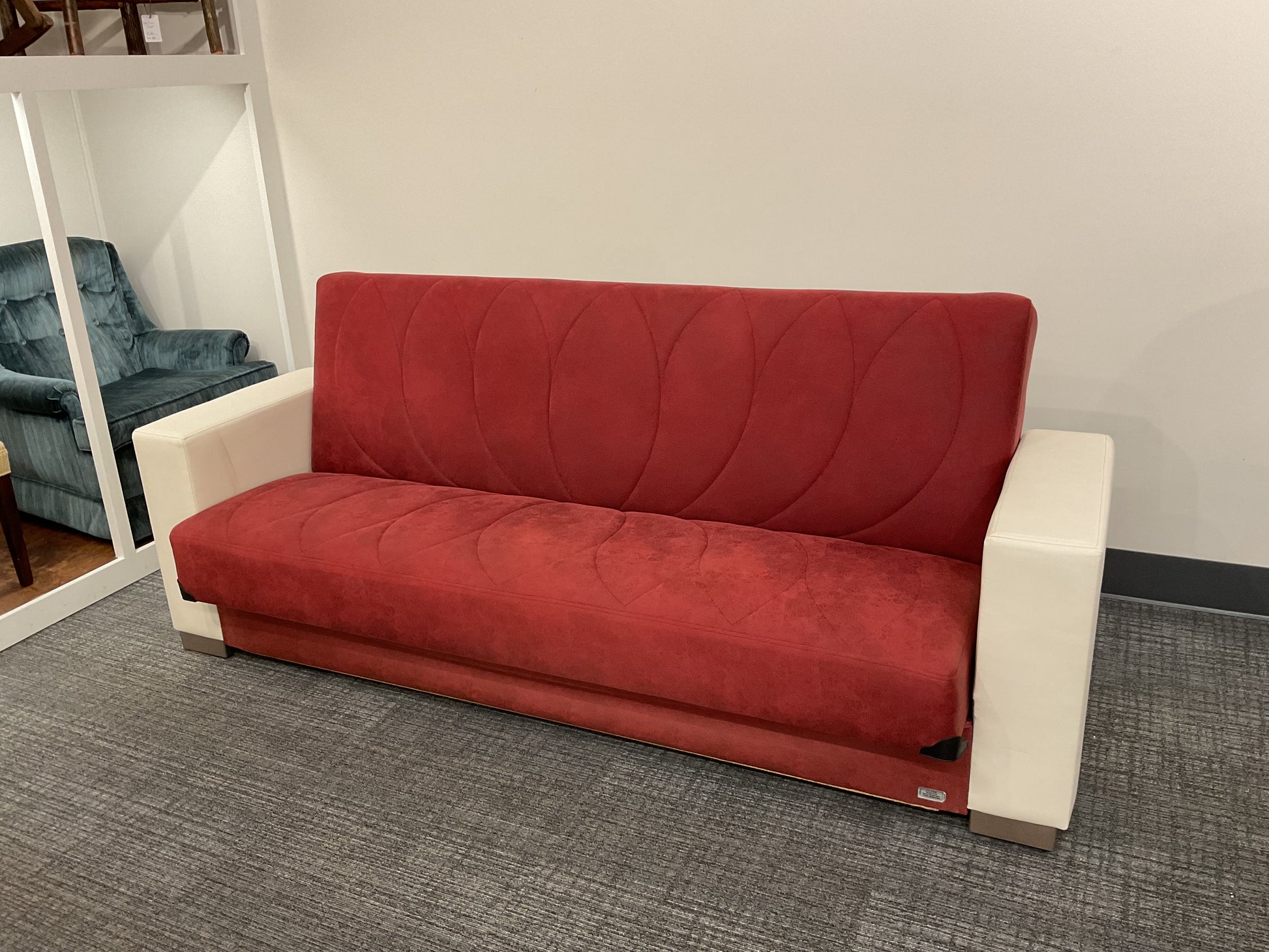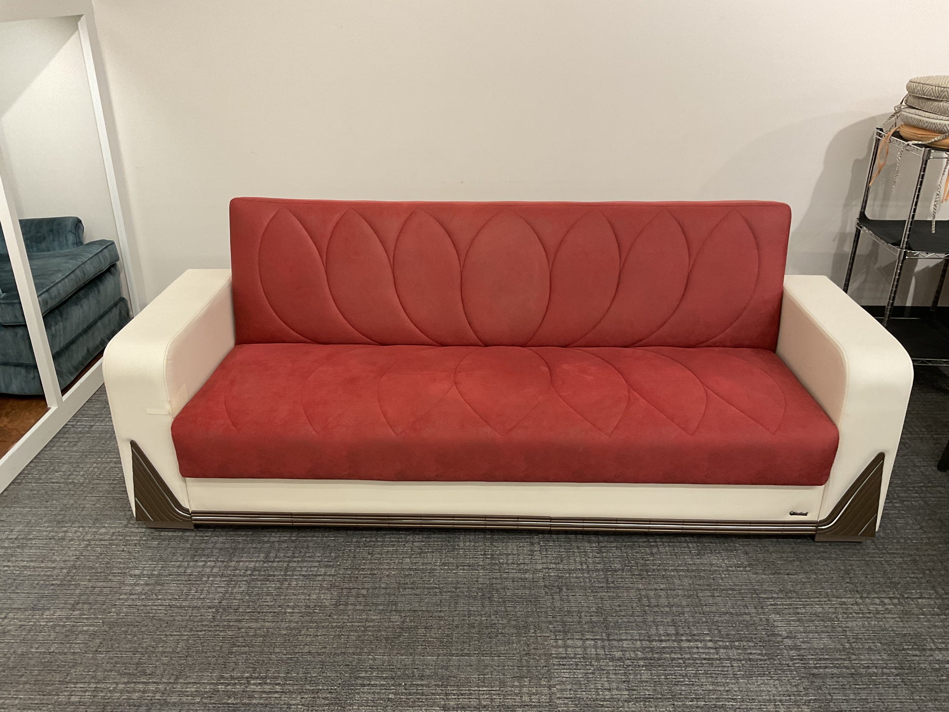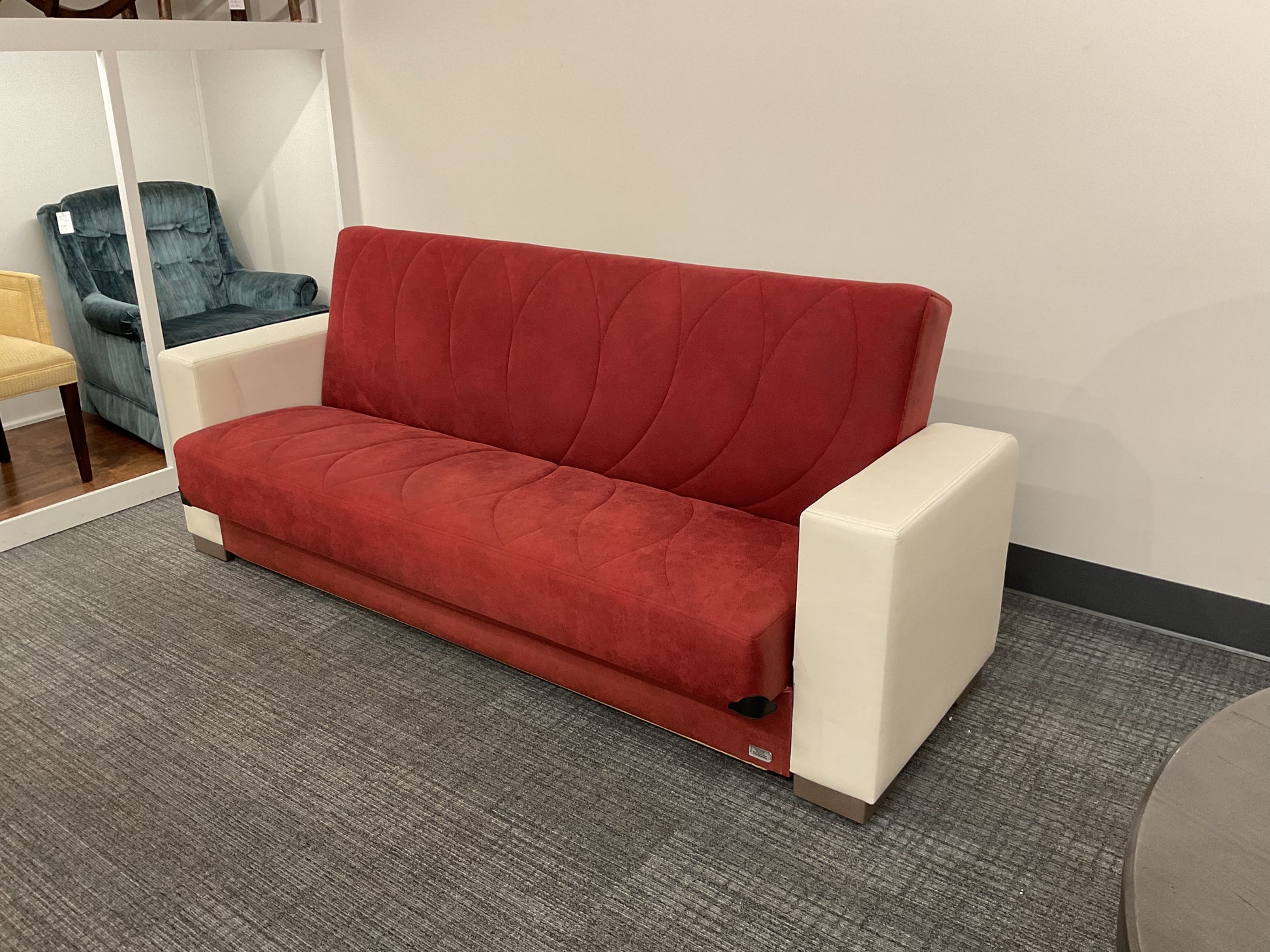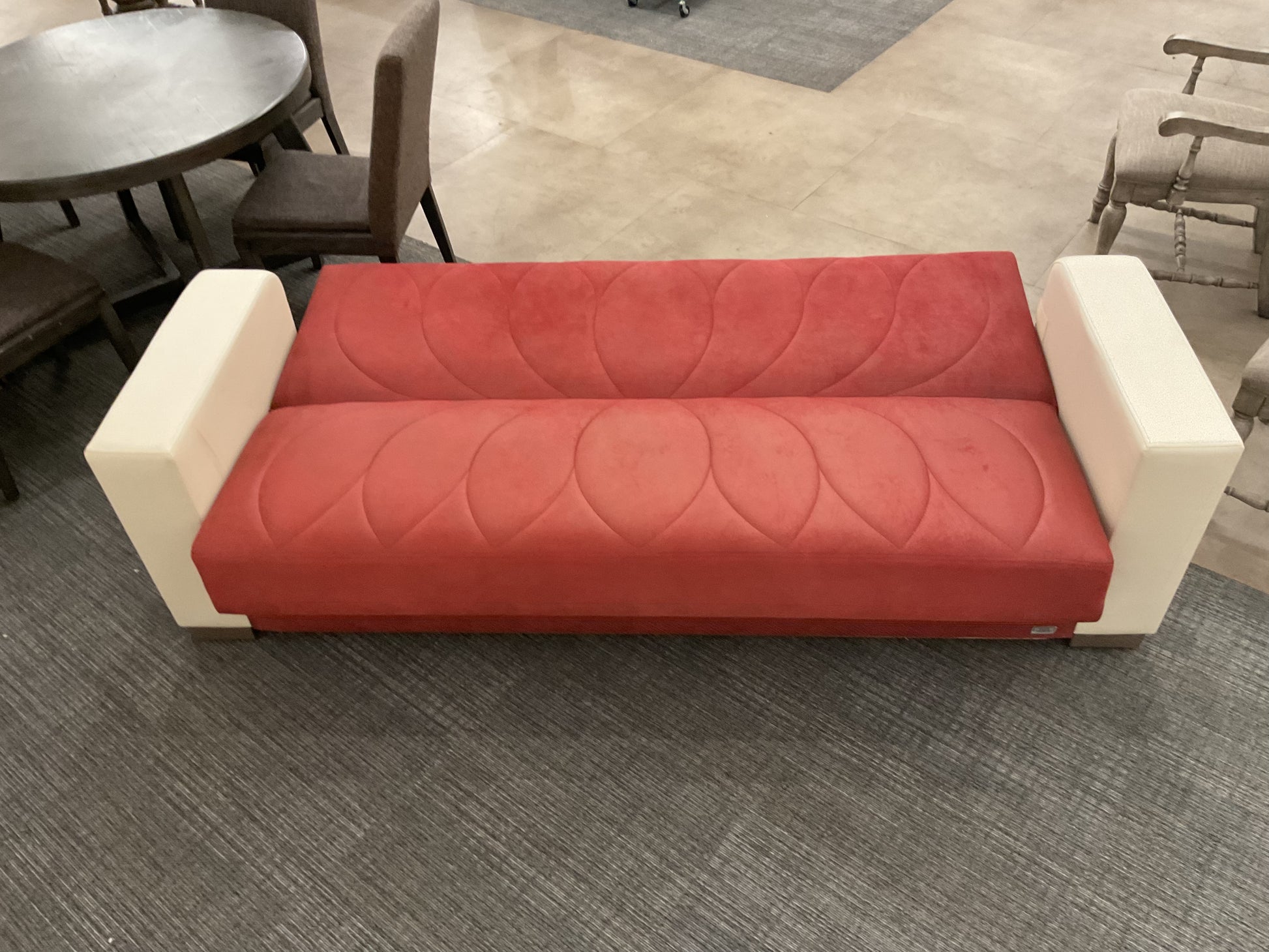 Upgrade your living space with our Back to the Future couch. This red and white piece not only adds a pop of color, but also doubles as a futon for guests. Enjoy the flexibility and functionality without sacrificing style. See photos for damages.