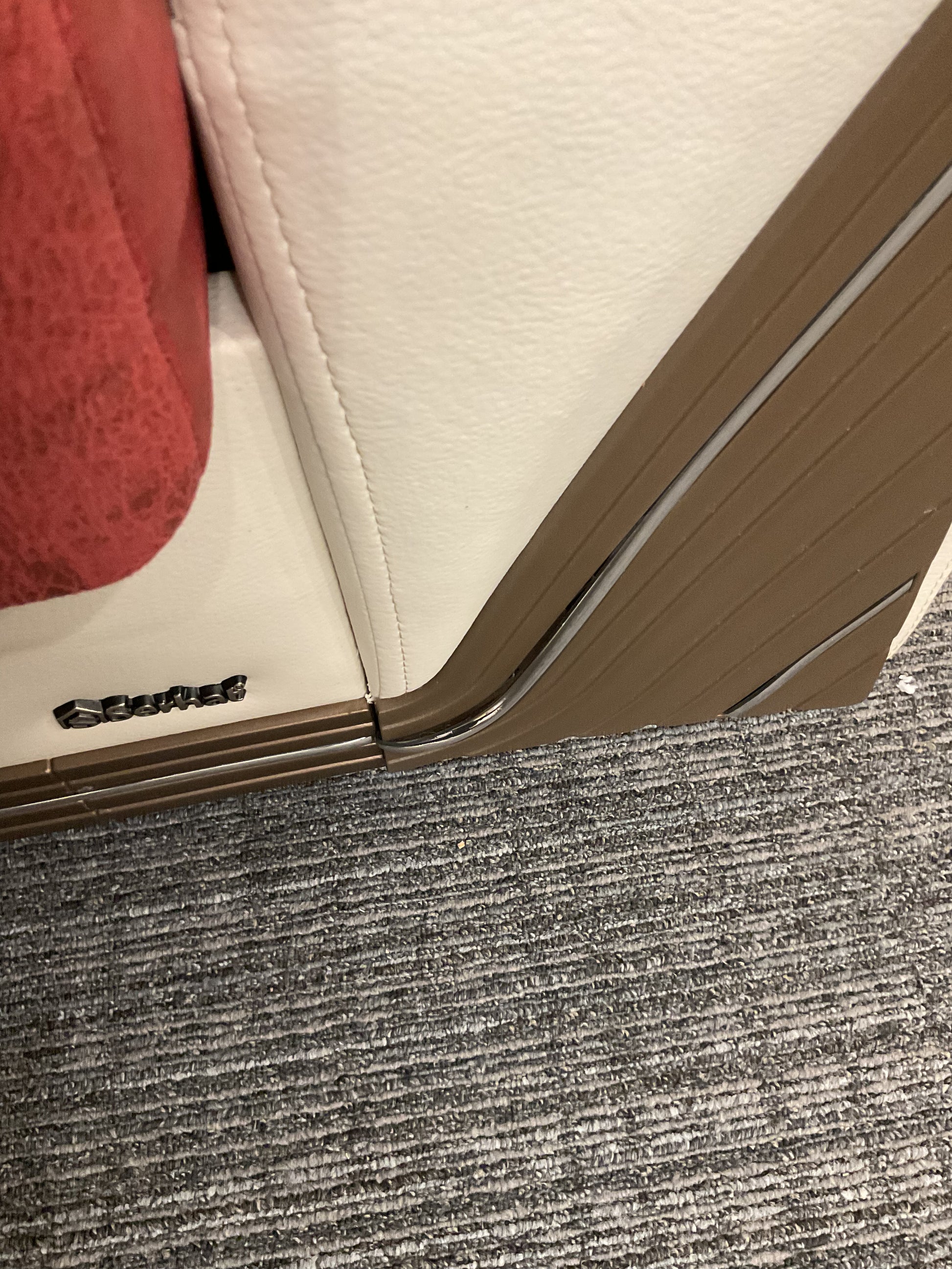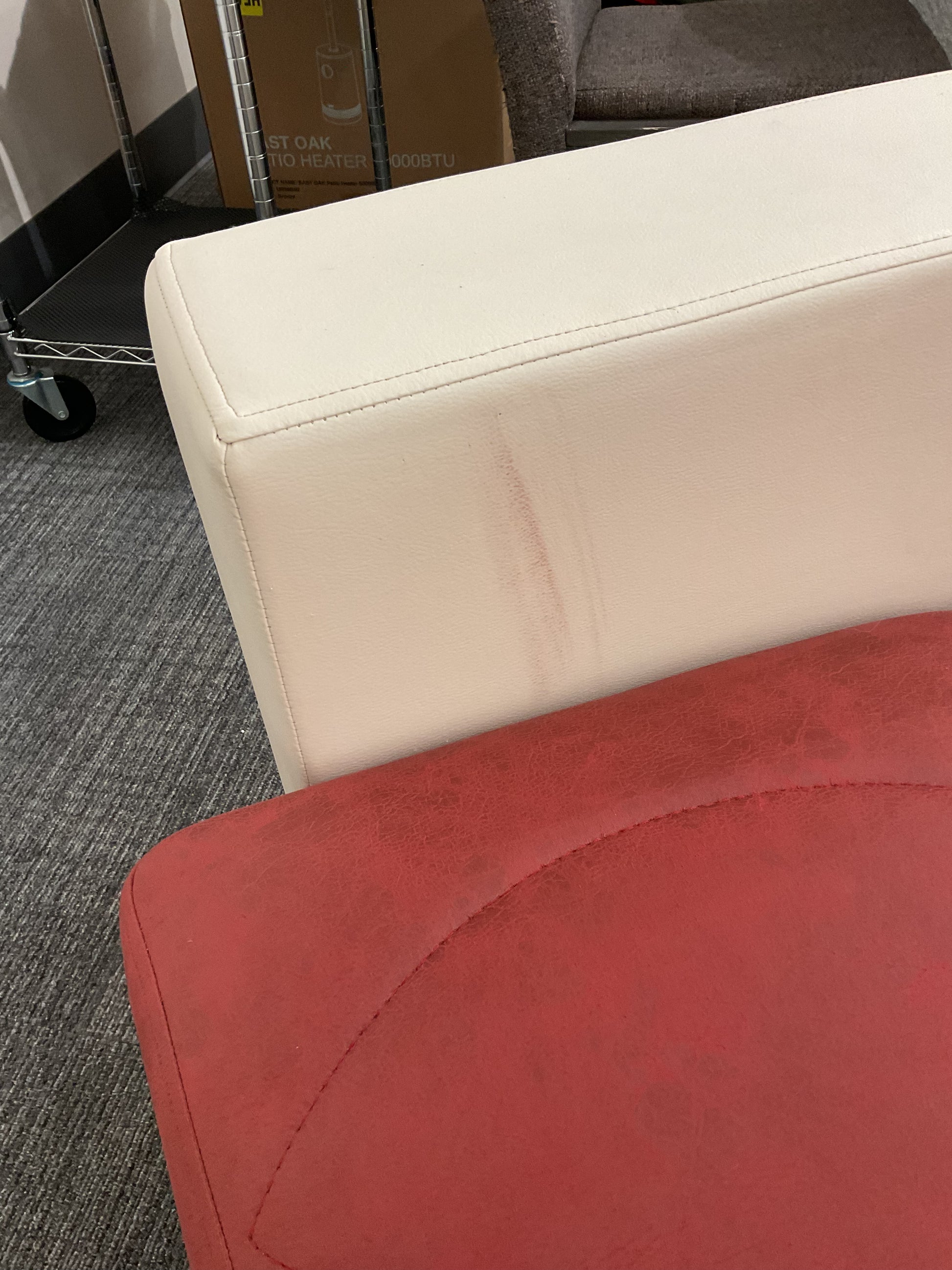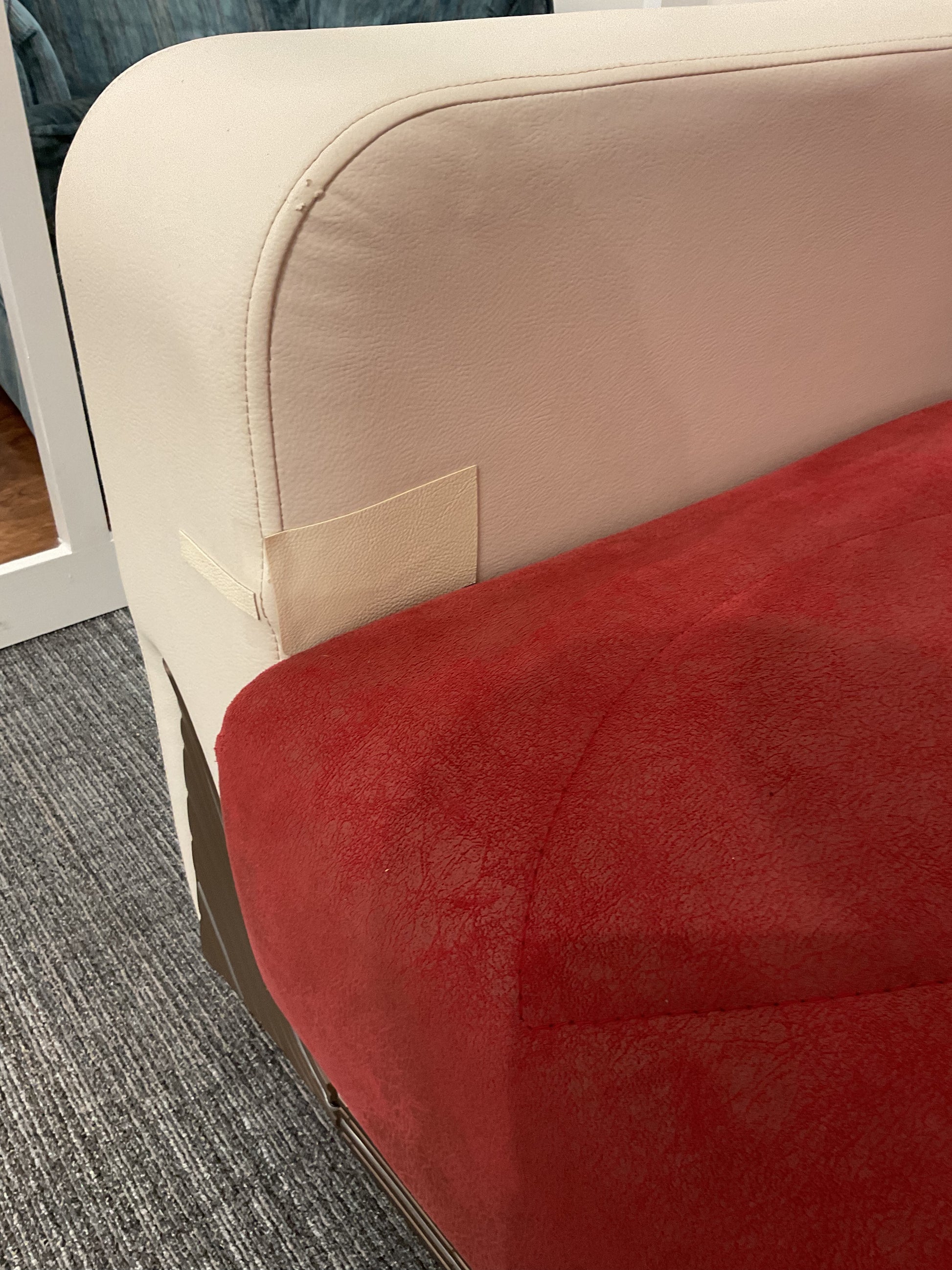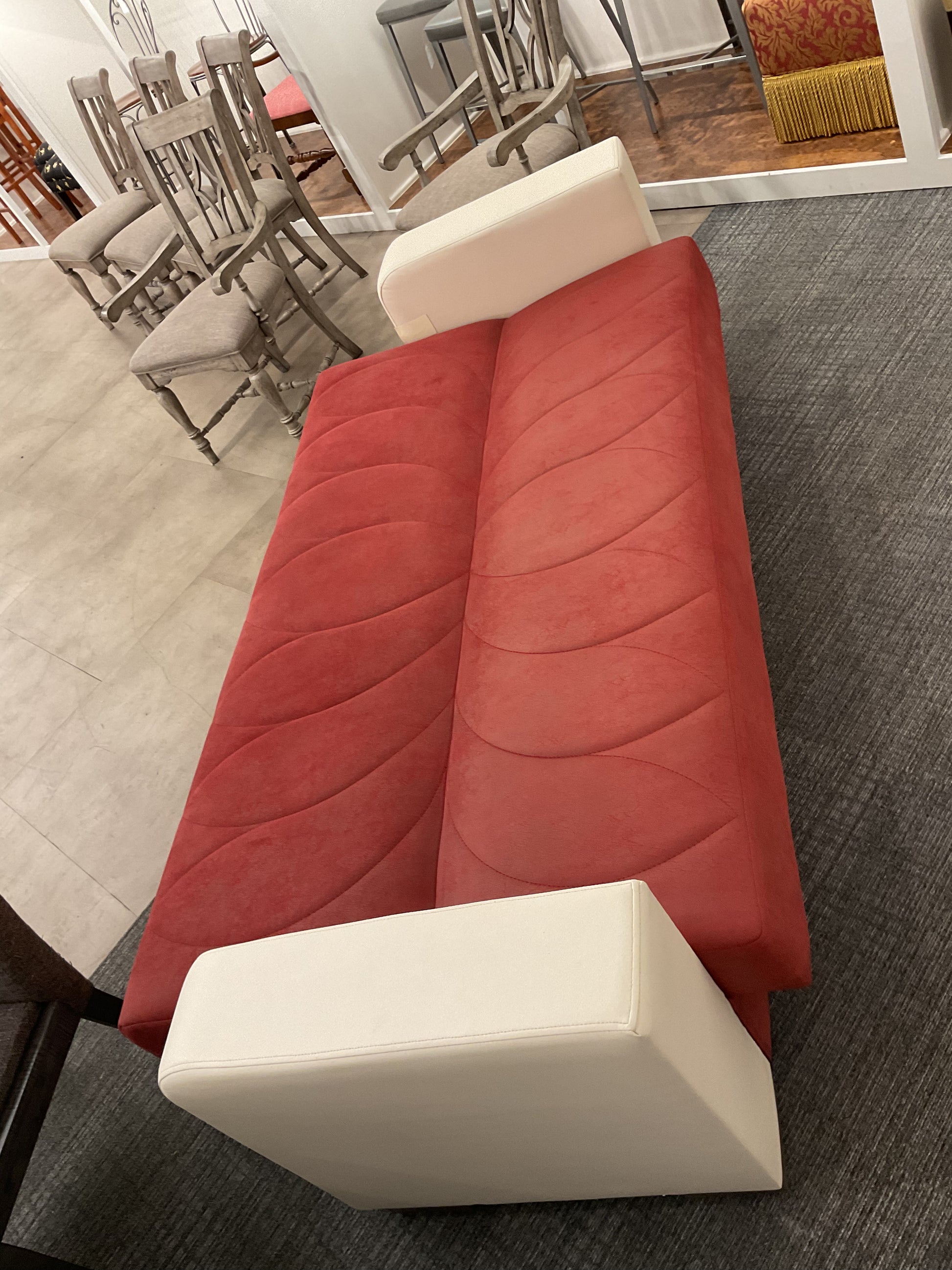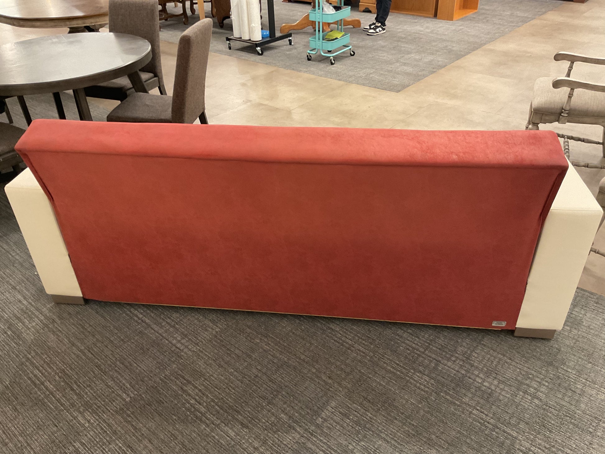 Upgrade your living space with our Back to the Future couch. This red and white piece not only adds a pop of color, but also doubles as a futon for guests. Enjoy the flexibility and functionality without sacrificing style. See photos for damages.