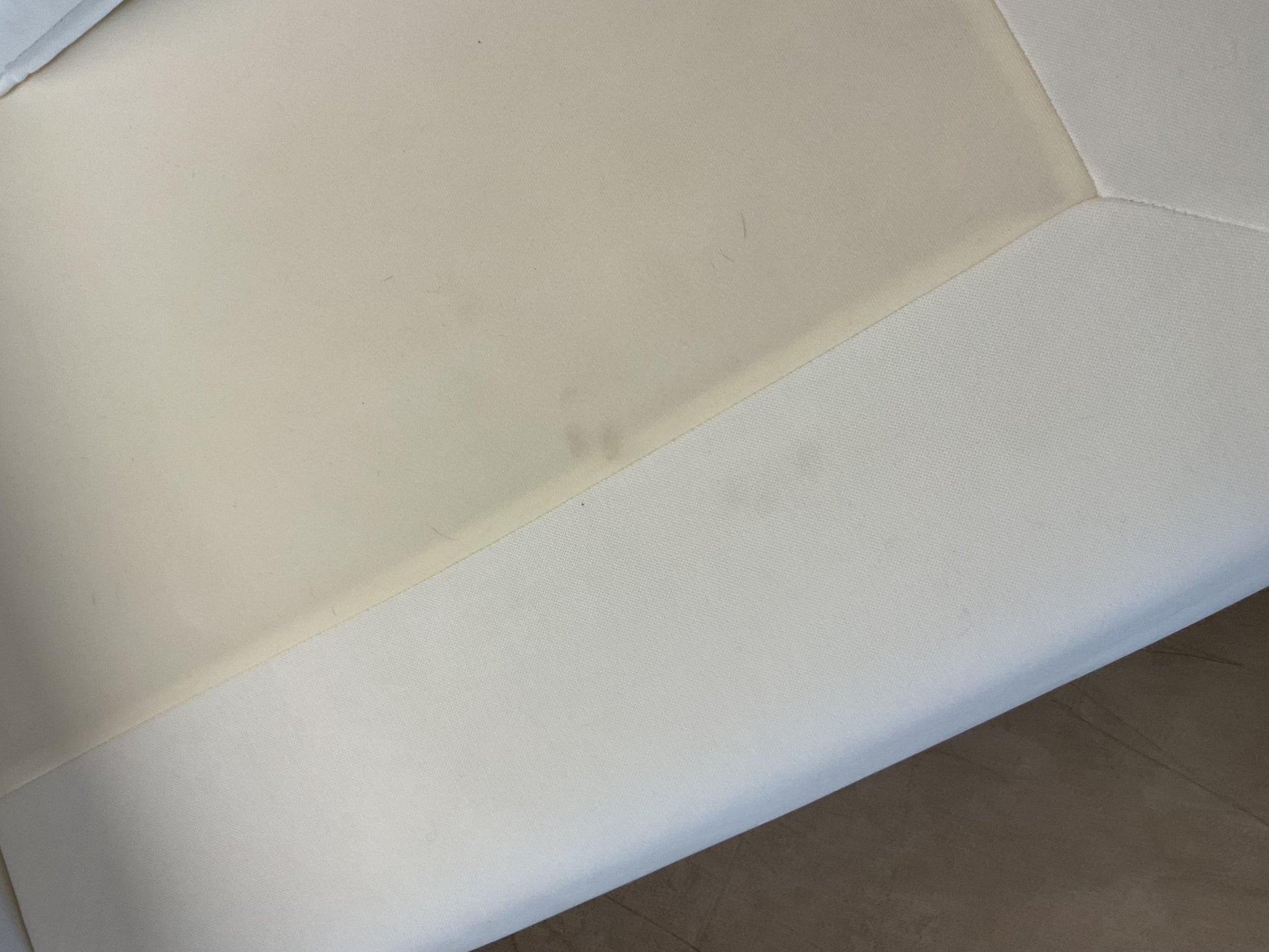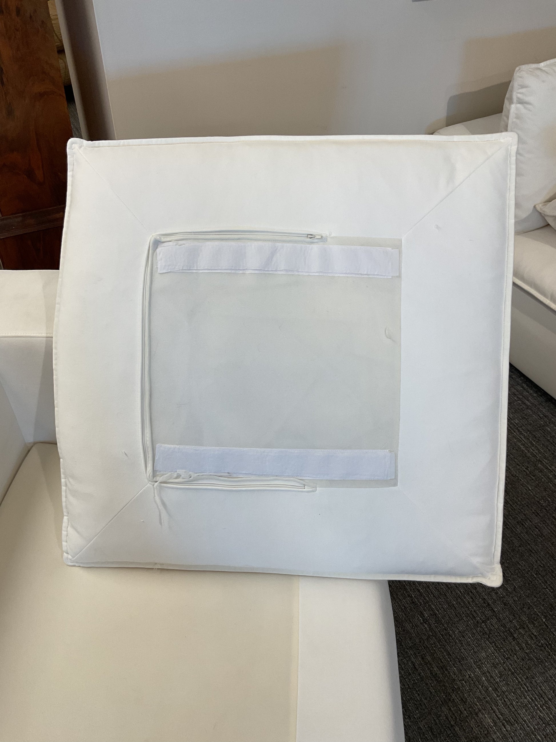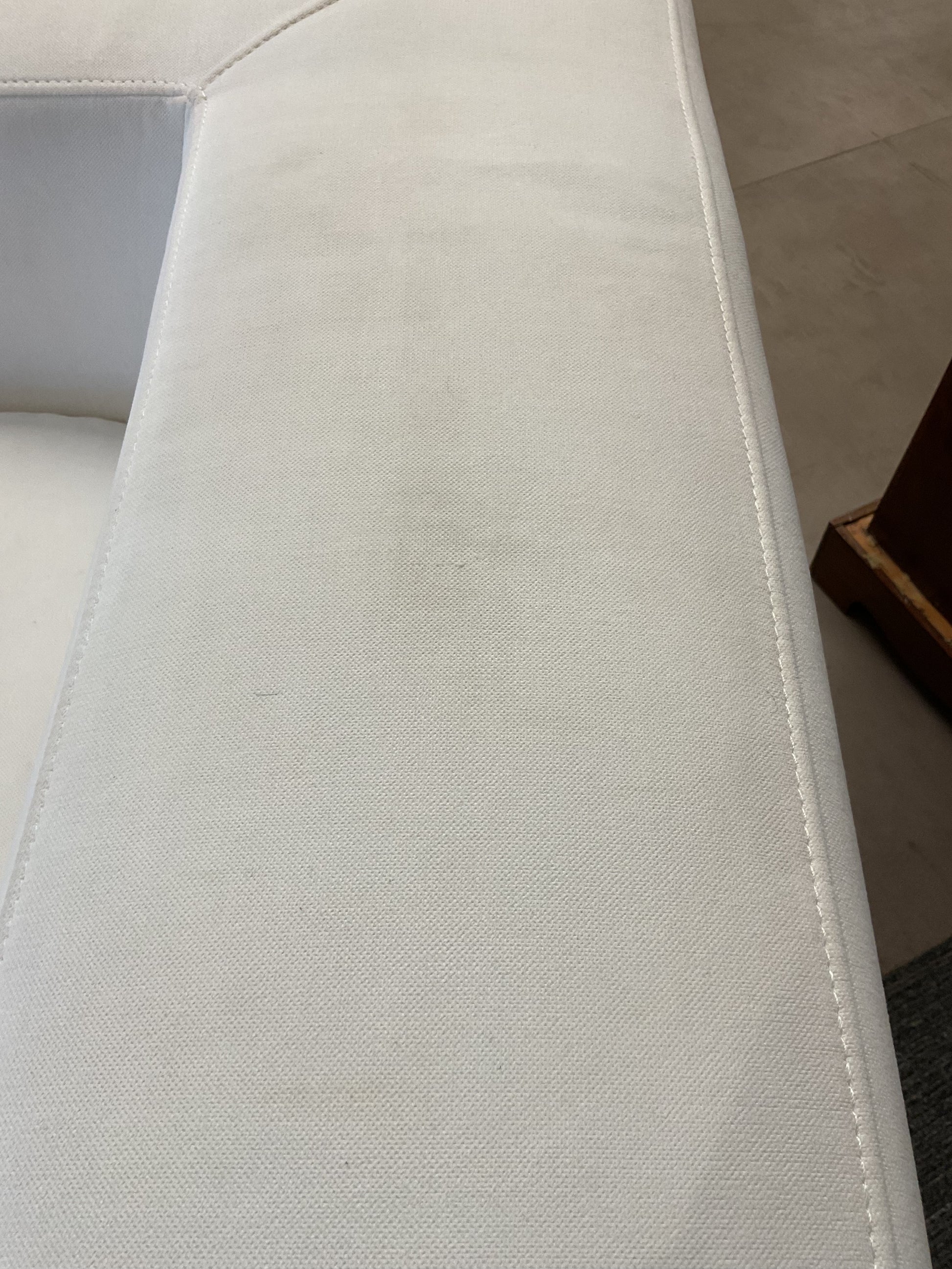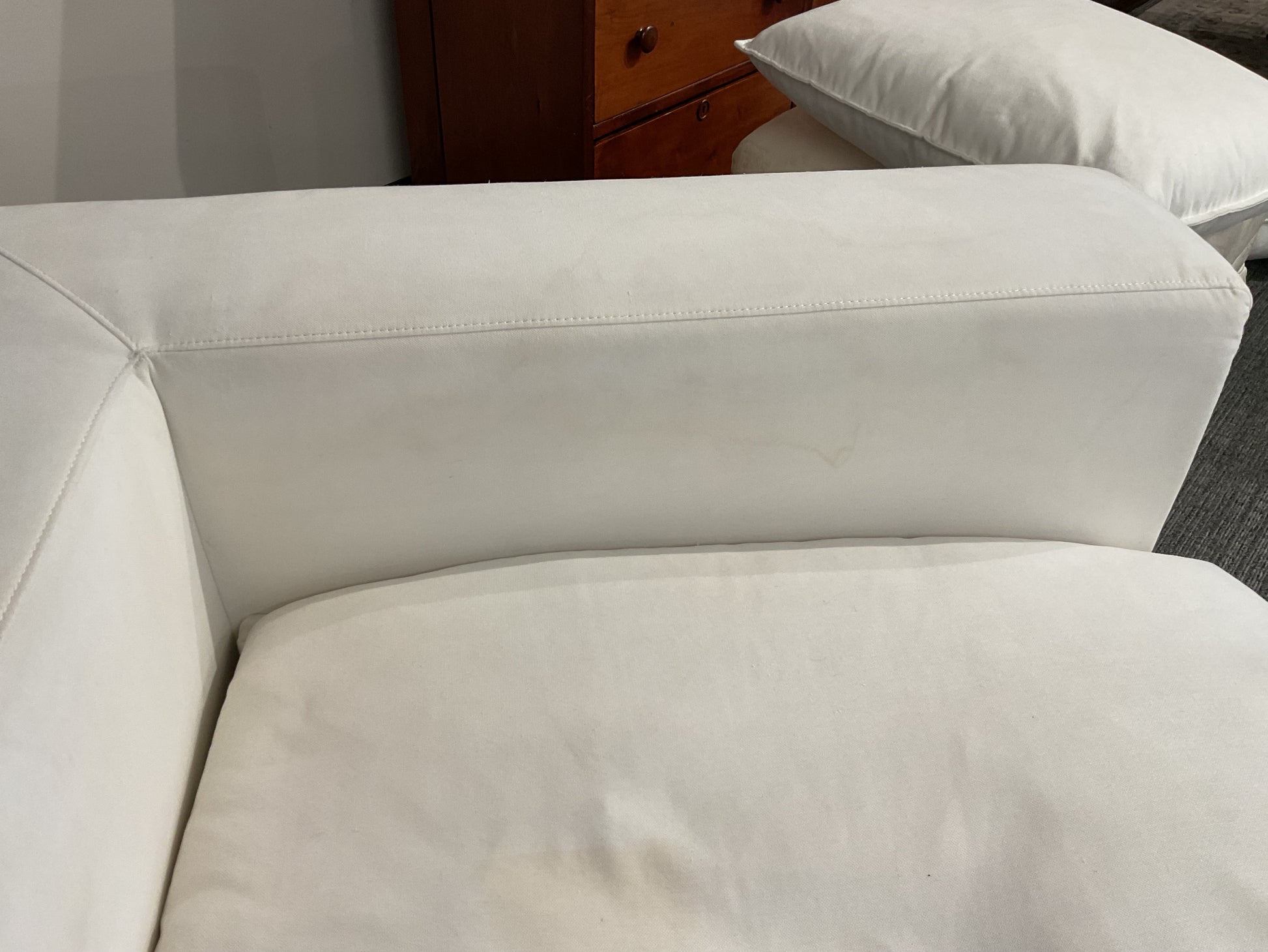 Expertly designed for style and comfort, our Cloudy Day Corner Chair adds a touch of elegance to any room. With its white finish and removable seat cushions, this chair is the perfect addition to your home. Now you can relax and unwind in luxury with our corner chair. Chair has a lot of stains even after shampooing. Look at photos for more detail.