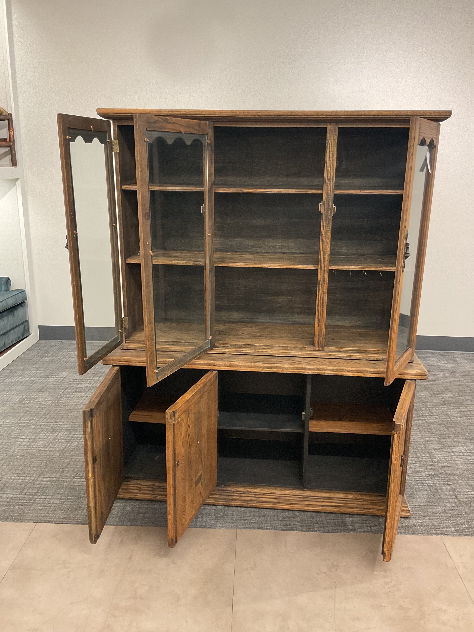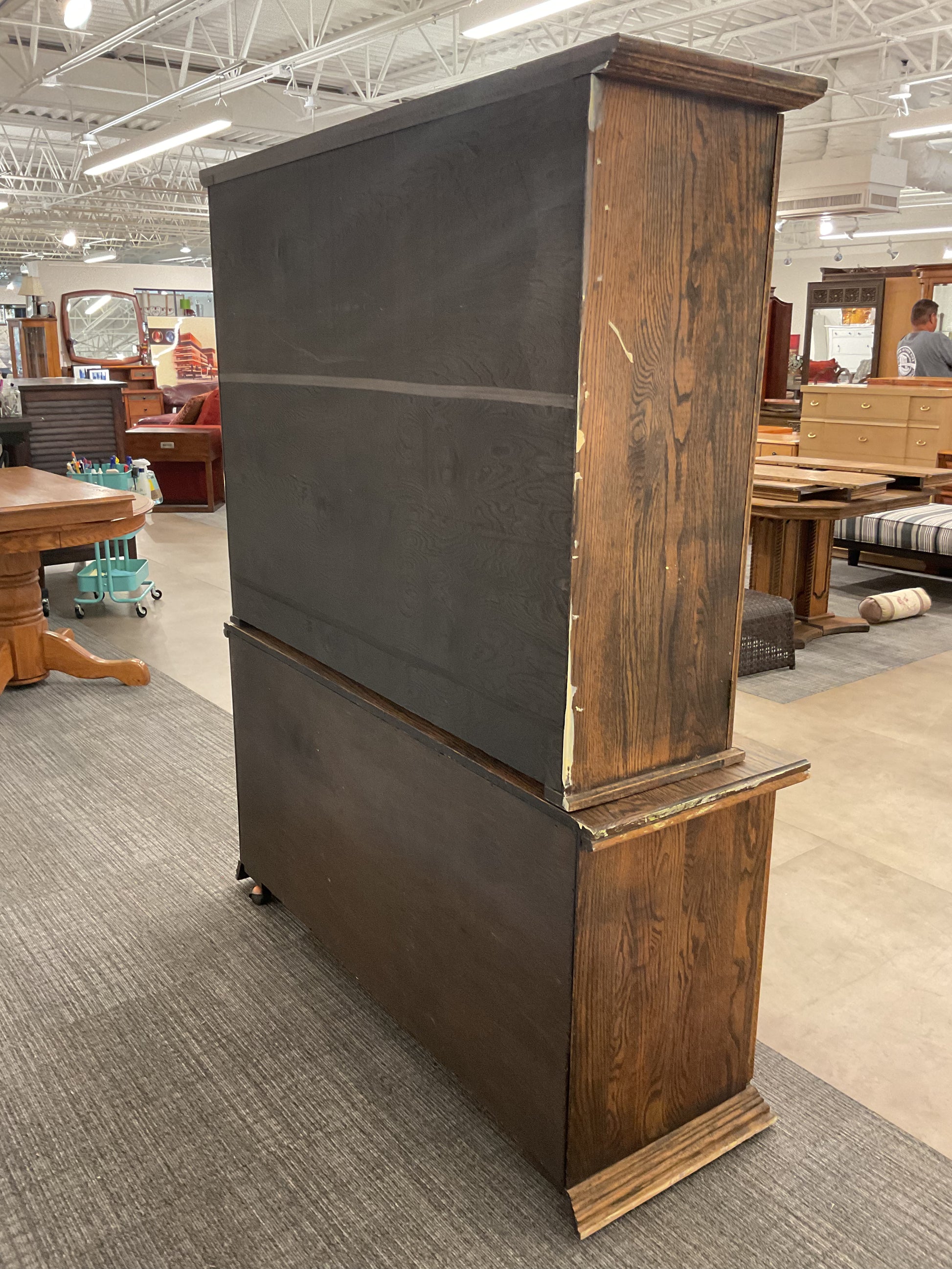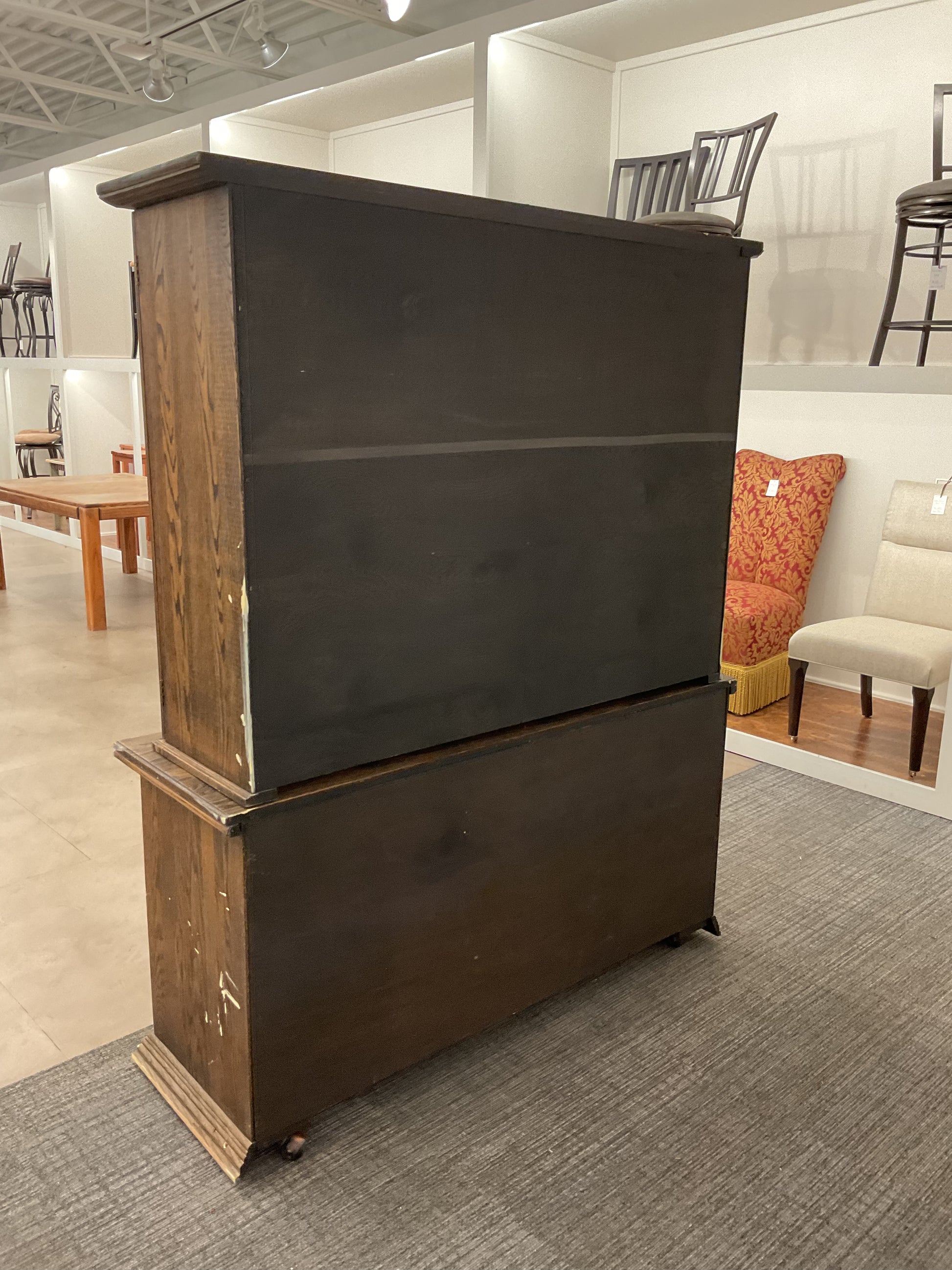 Expertly crafted and timeless, our antique hutch boasts a two-piece design for versatile storage options. Made to last, this hutch adds a touch of elegance to any space. Organize dishes, linens, and more with ease while elevating your decor.