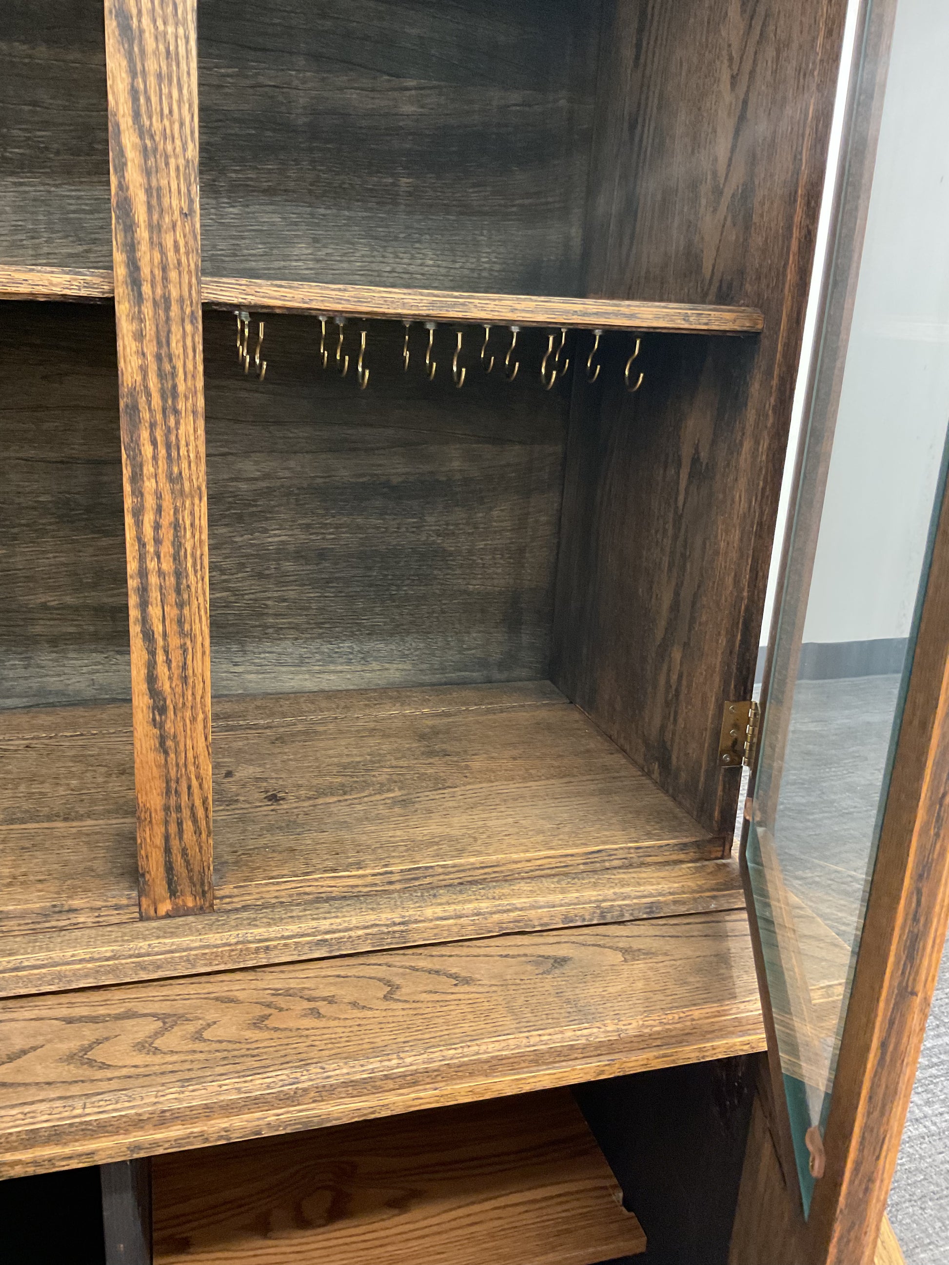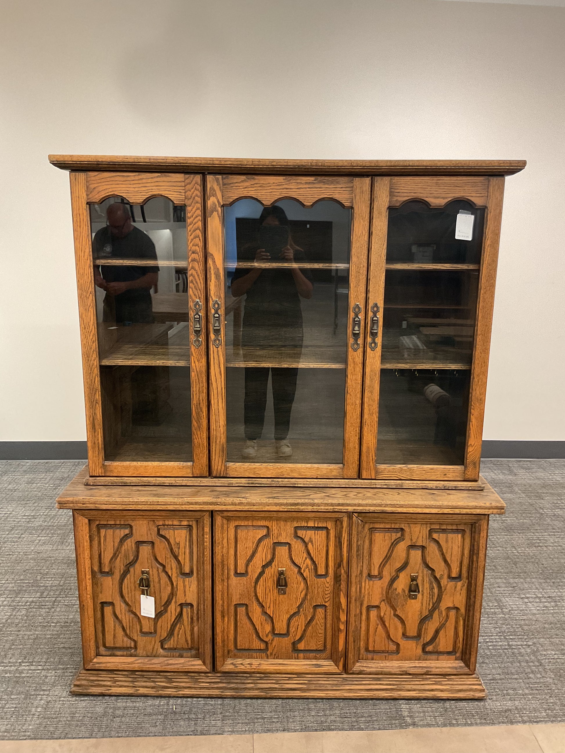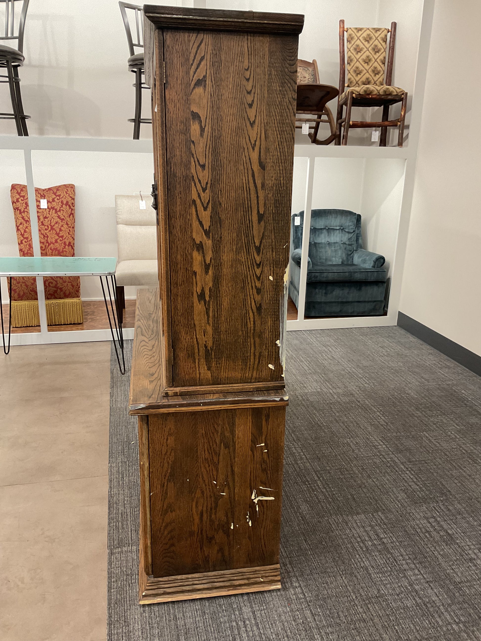 Expertly crafted and timeless, our antique hutch boasts a two-piece design for versatile storage options. Made to last, this hutch adds a touch of elegance to any space. Organize dishes, linens, and more with ease while elevating your decor.