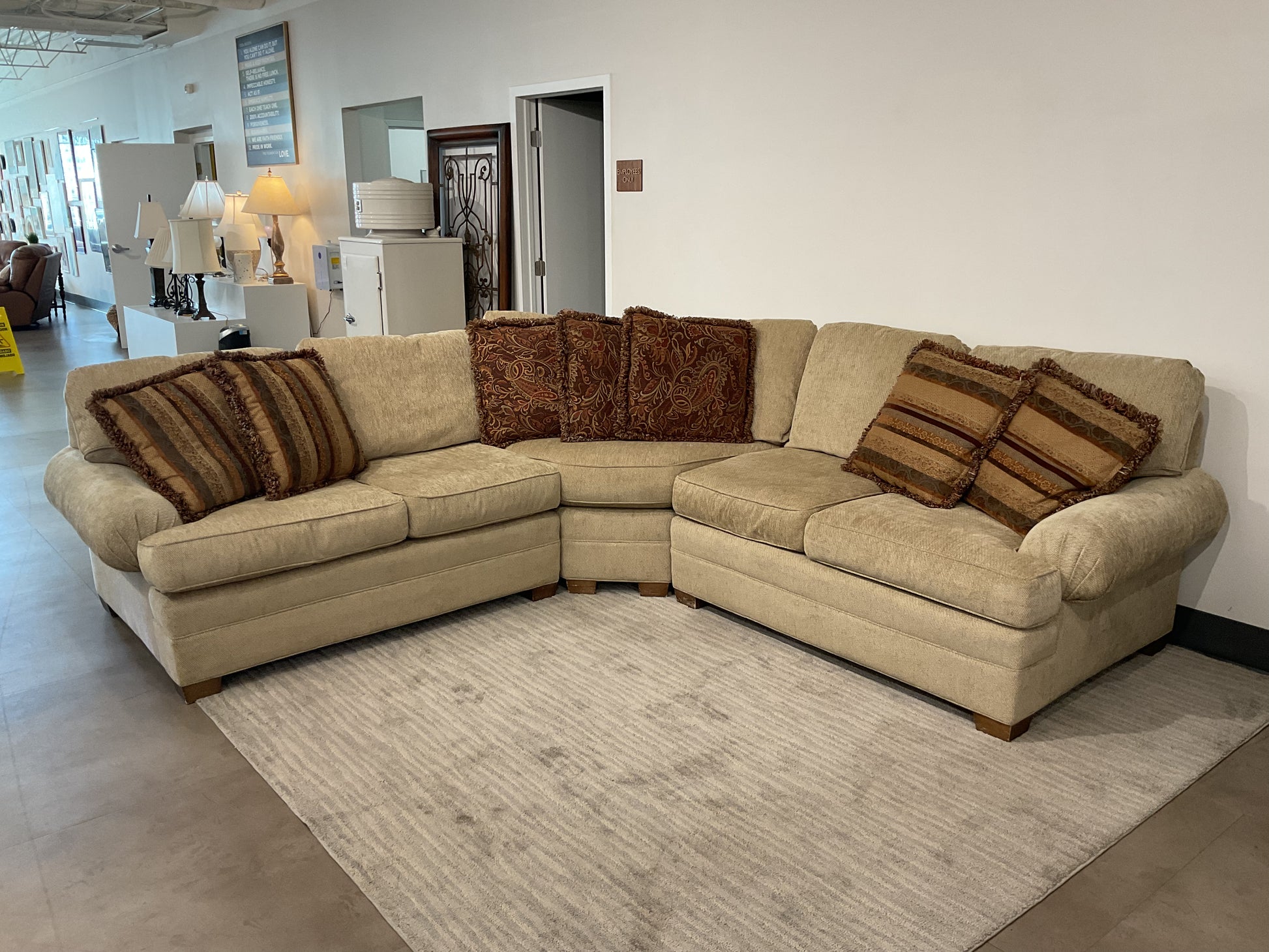 With the Mi casa Tu casa sofa, add warmth and comfort to any living space. This tan sectional comes with accent pillows, maximizing style and coziness. Create a welcoming and inviting atmosphere with this essential piece.