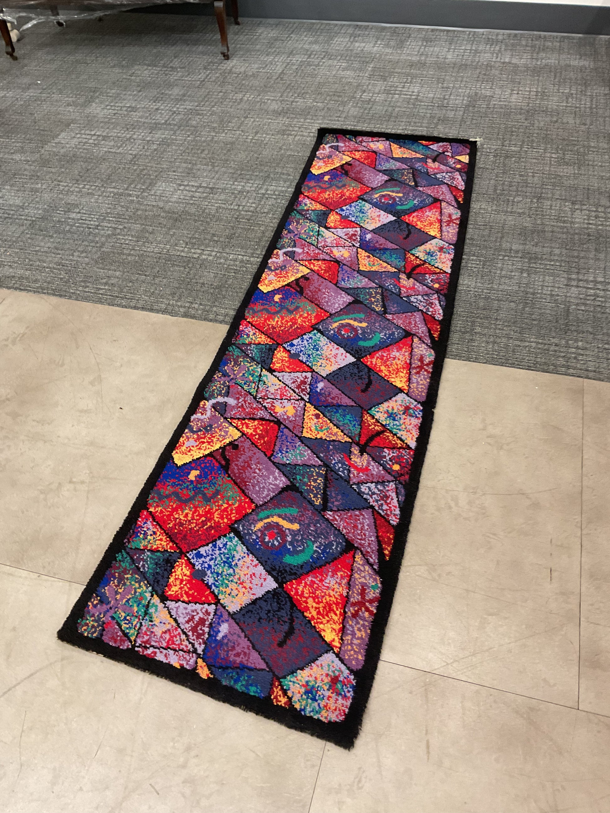 This 80s design runner rug, known as "Saved by the rug", adds a touch of nostalgia to any room. With its vibrant colors and unique pattern, it is sure to be a conversation starter. Made with high-quality materials, this rug is not only stylish but also durable. Perfect for adding a retro vibe to your home decor.