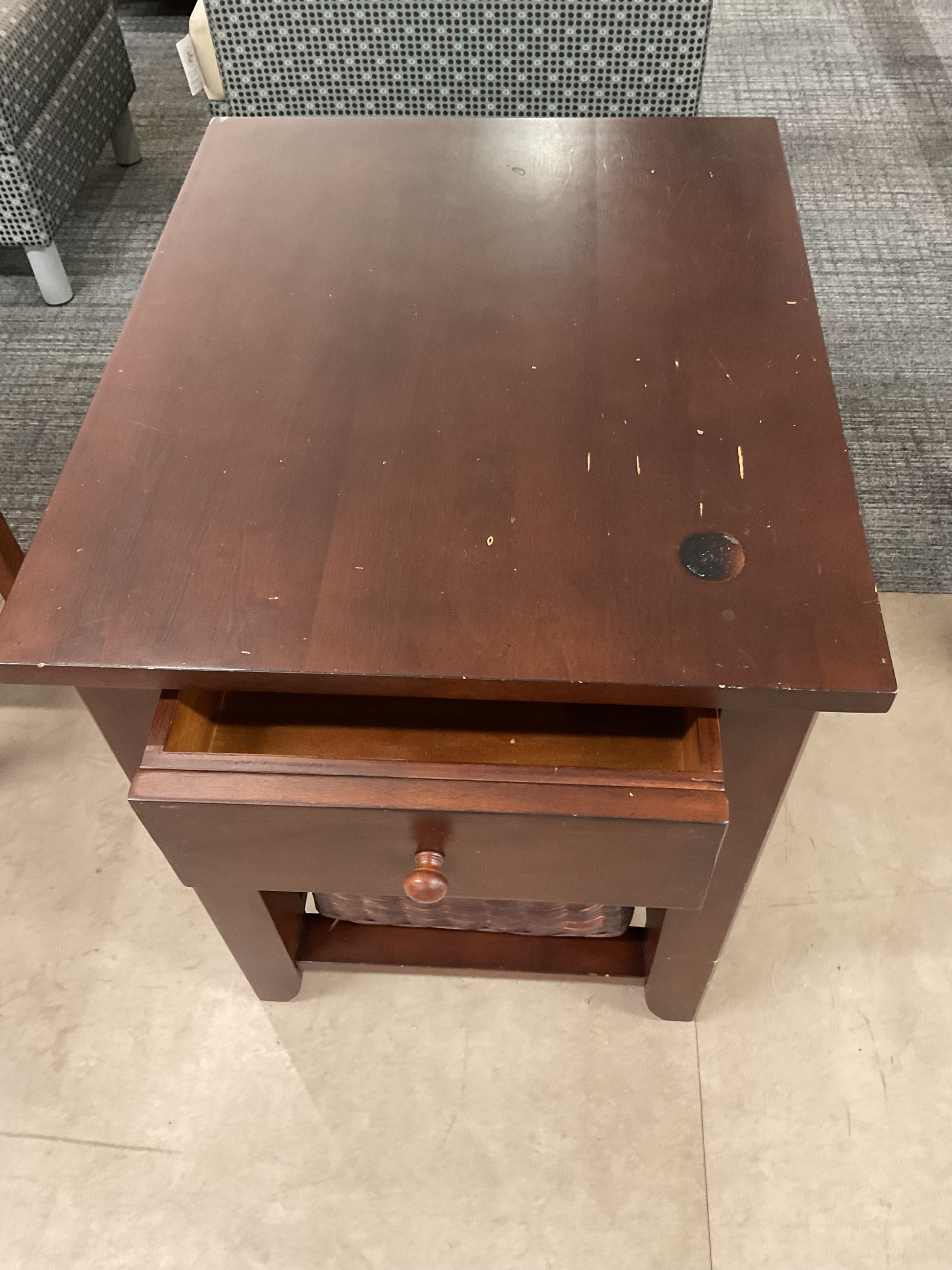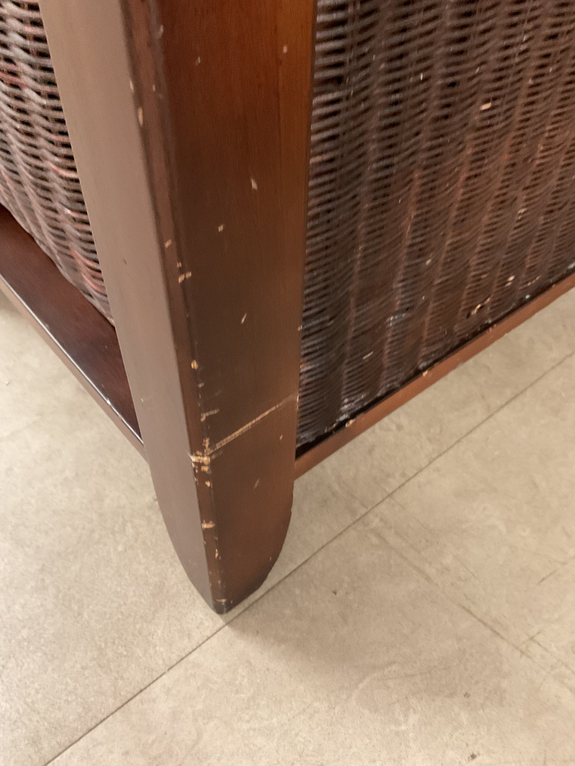 Complete your outdoor seating area with our Wicker Wood Side Table. Made from durable materials, it adds a touch of natural charm to any space. Perfect for holding drinks, books, and more, it combines functionality with style for your ultimate relaxation. Please refer to photos for any damages.