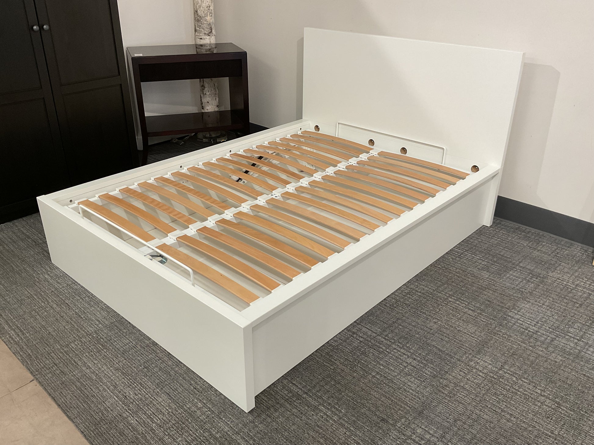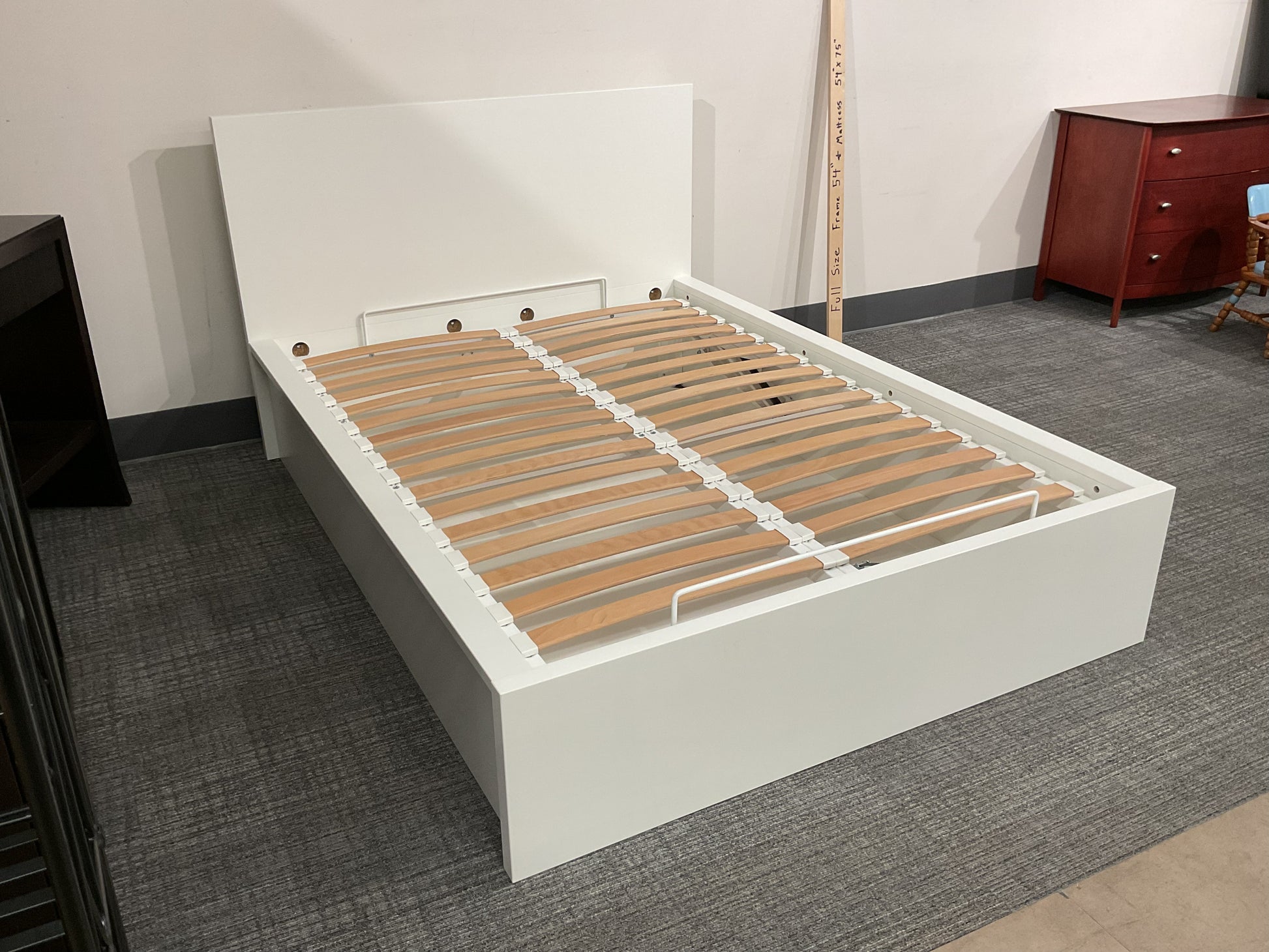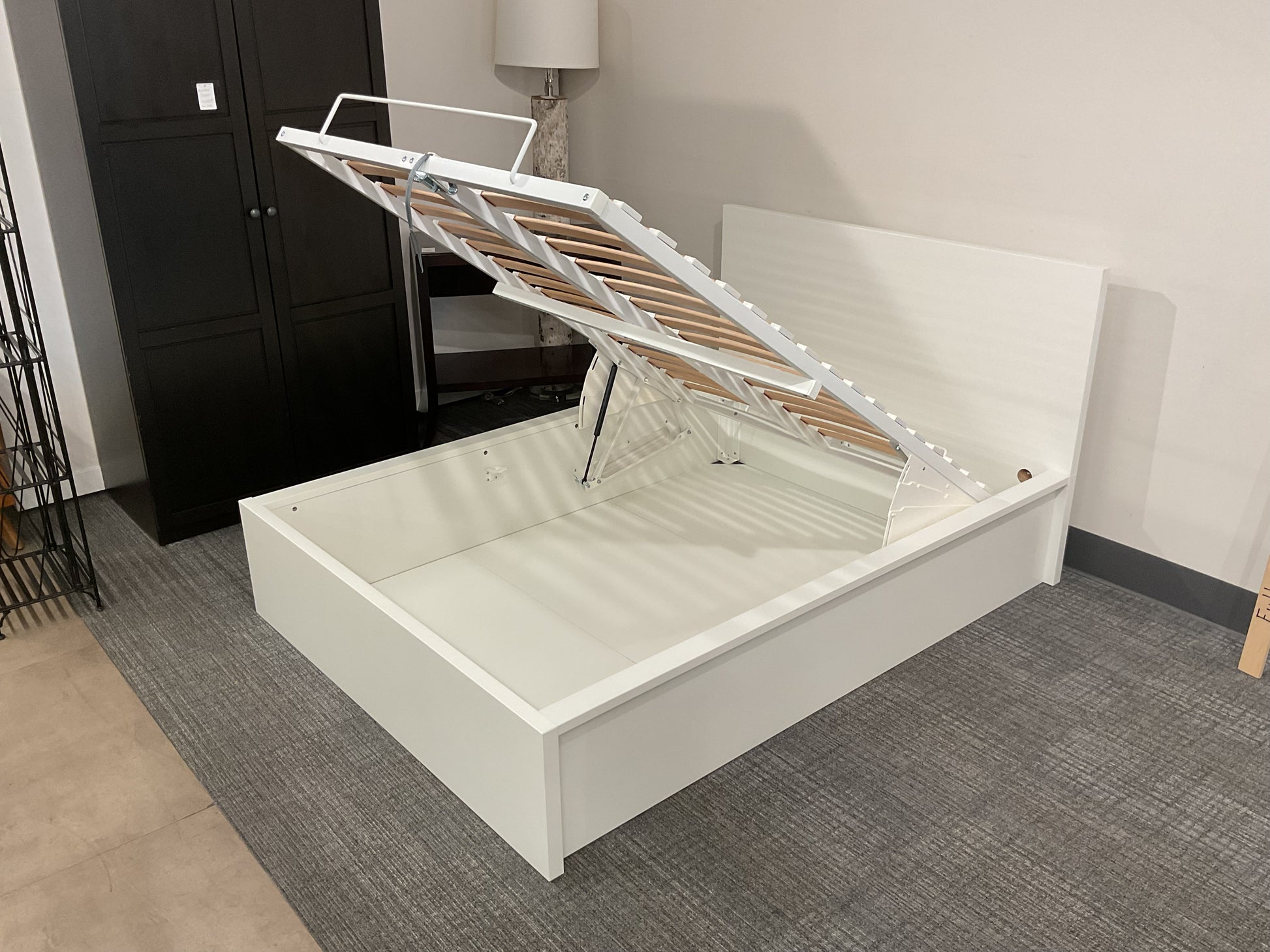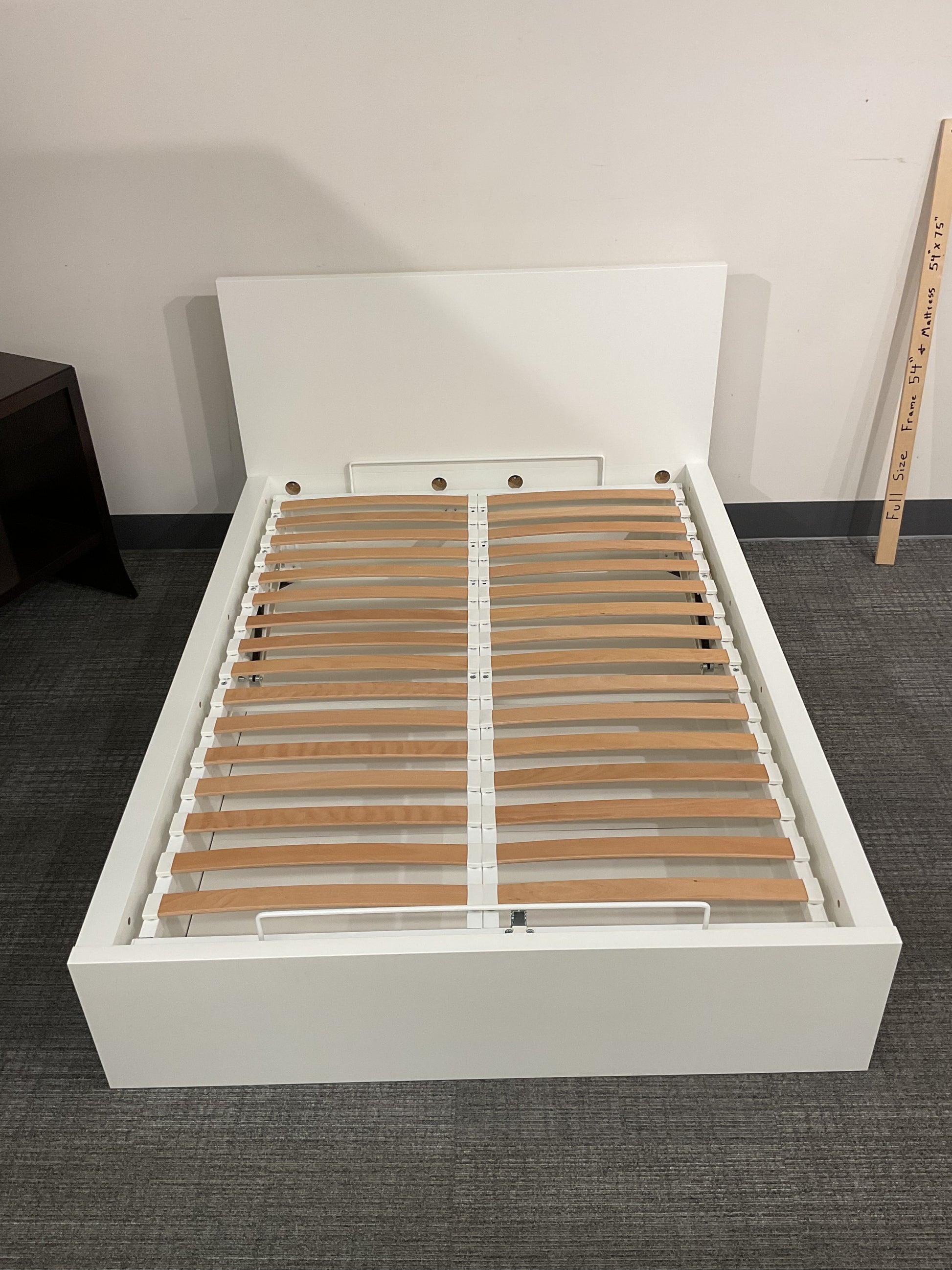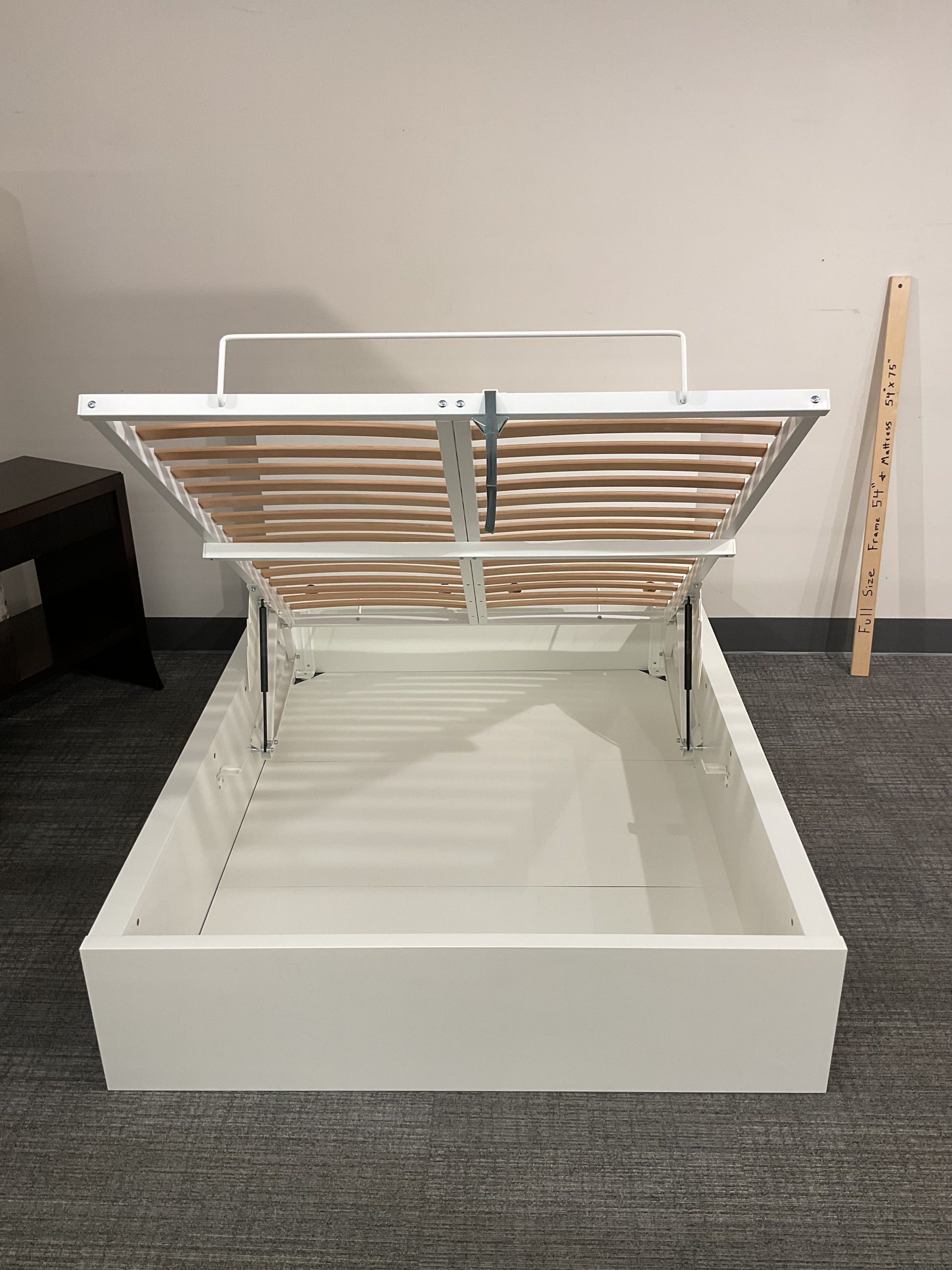 The Full Ultimate Hiding Spot Frame is a white full-size bed frame featuring convenient under-mattress storage. This design maximizes space efficiency, offering a practical solution for organizing bedding and personal items, contributing to a clutter-free environment.