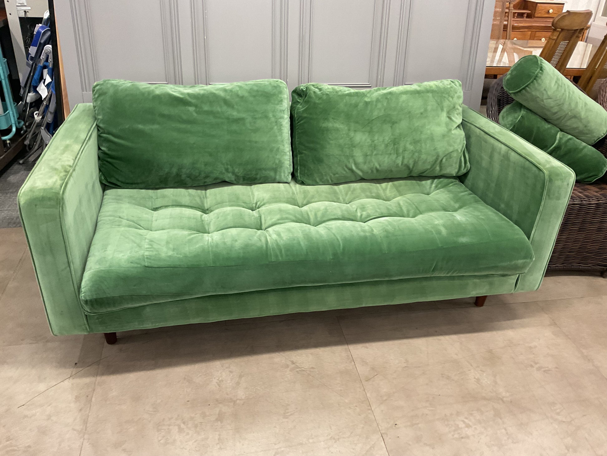 Stylish green velvet sofa. Has a cool tufted seat and two comfy back cushions. Comes with two matching bolster pillows too. Modern design, super soft fabric. Refer to photos for imperfections.