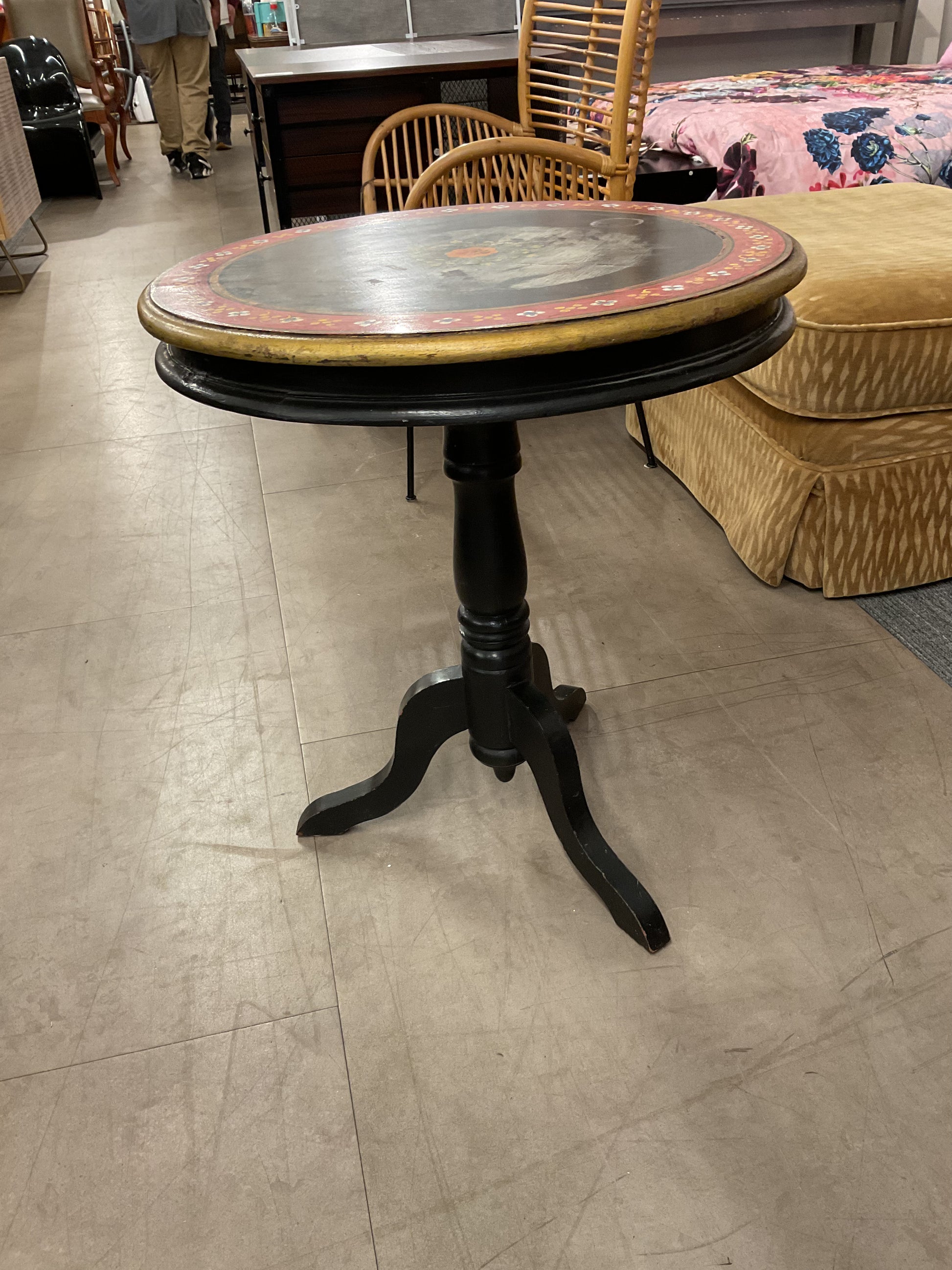 The Italian Flowers Side Table features a petite round design with an intricate floral pattern set against a sleek black background. This table not only serves as a functional accessory but also enhances aesthetic appeal, making it suitable for various interior styles. Its compact size allows for versatile placement in small spaces. Refer to photos for imperfections.
