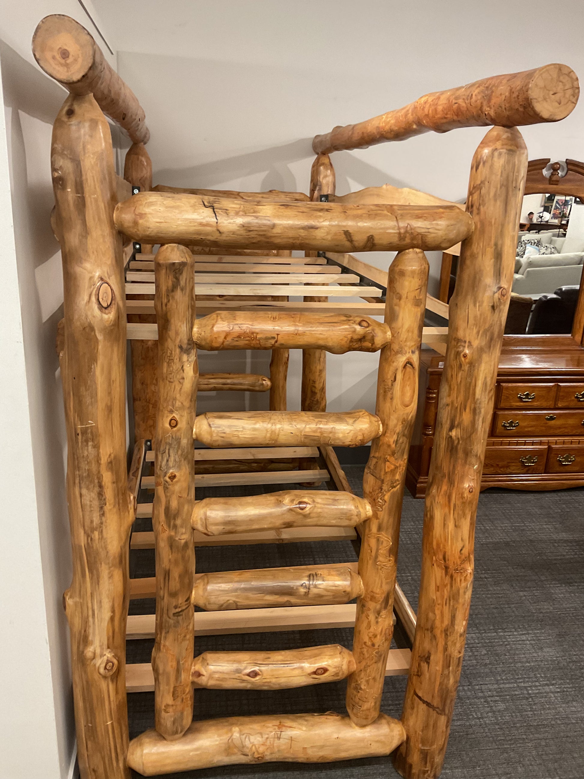 This rustic log bunk bed is a double twin constructed from robust wooden logs and features two elevated sleeping areas. It is equipped with built-in ladders on both sides for easy access. The bed boasts a natural wood finish, enhancing its aesthetic appeal.