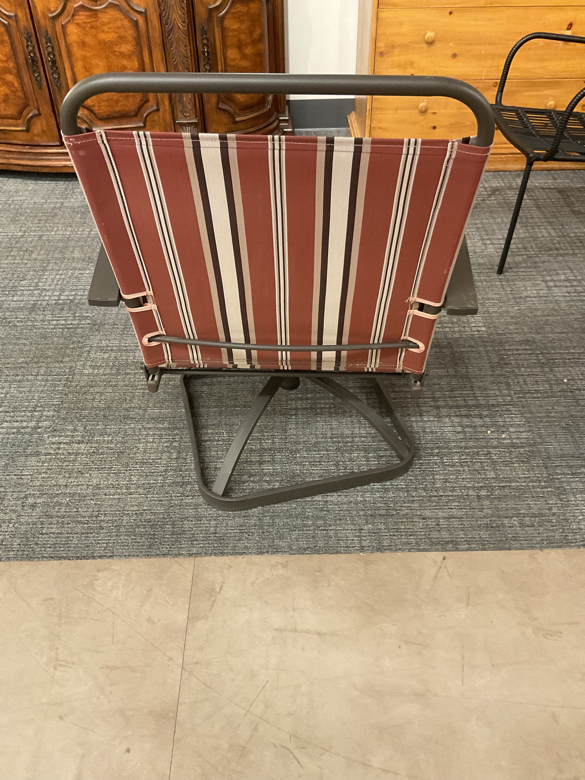 The Striped Swivel Chair is designed for outdoor use, providing 360-degree rotation for enhanced mobility. Its structure ensures durability against weather elements, making it suitable for long-term outdoor seating. The ergonomic design promotes comfort during extended periods of use, supporting relaxation and leisure activities.