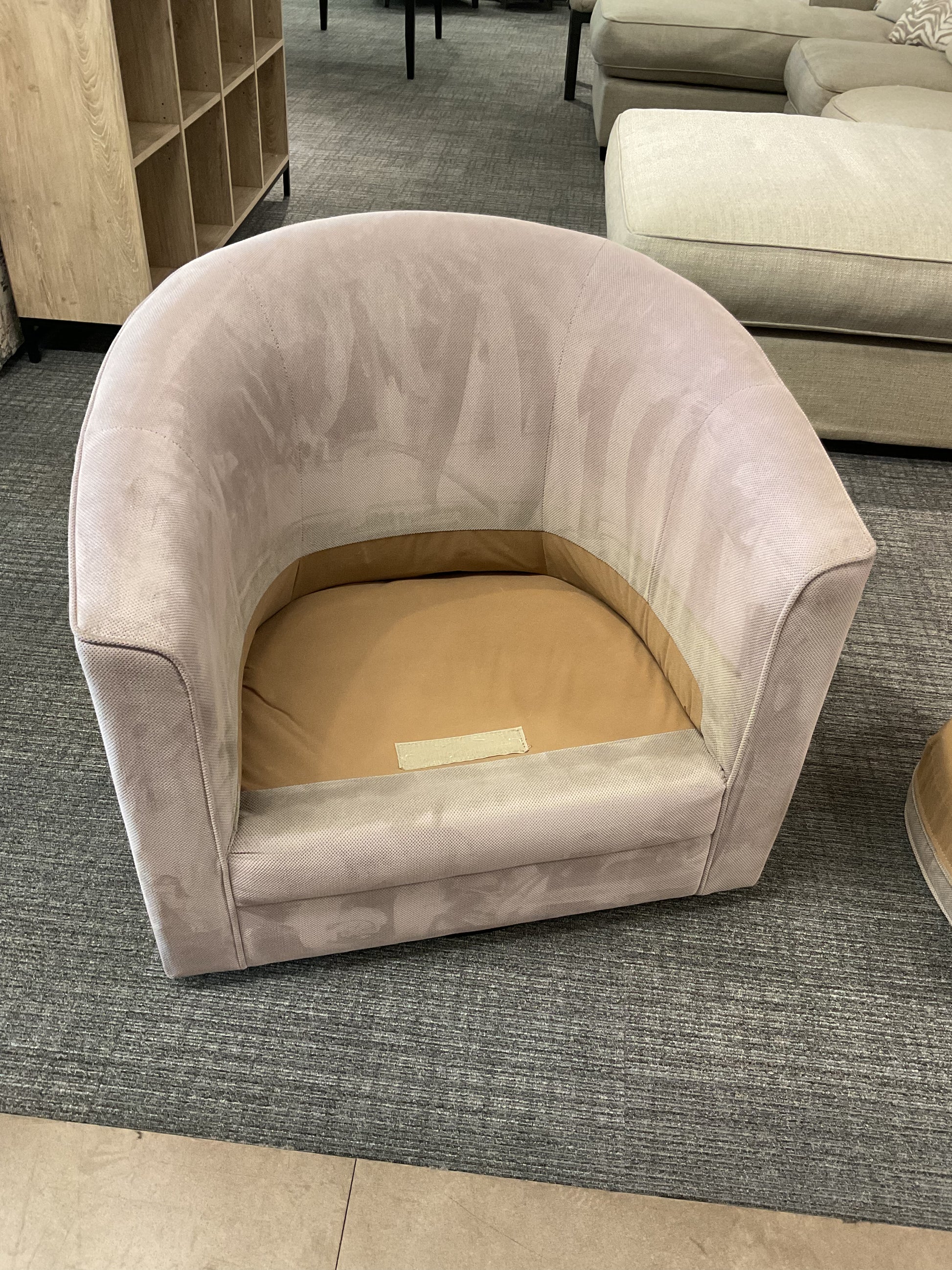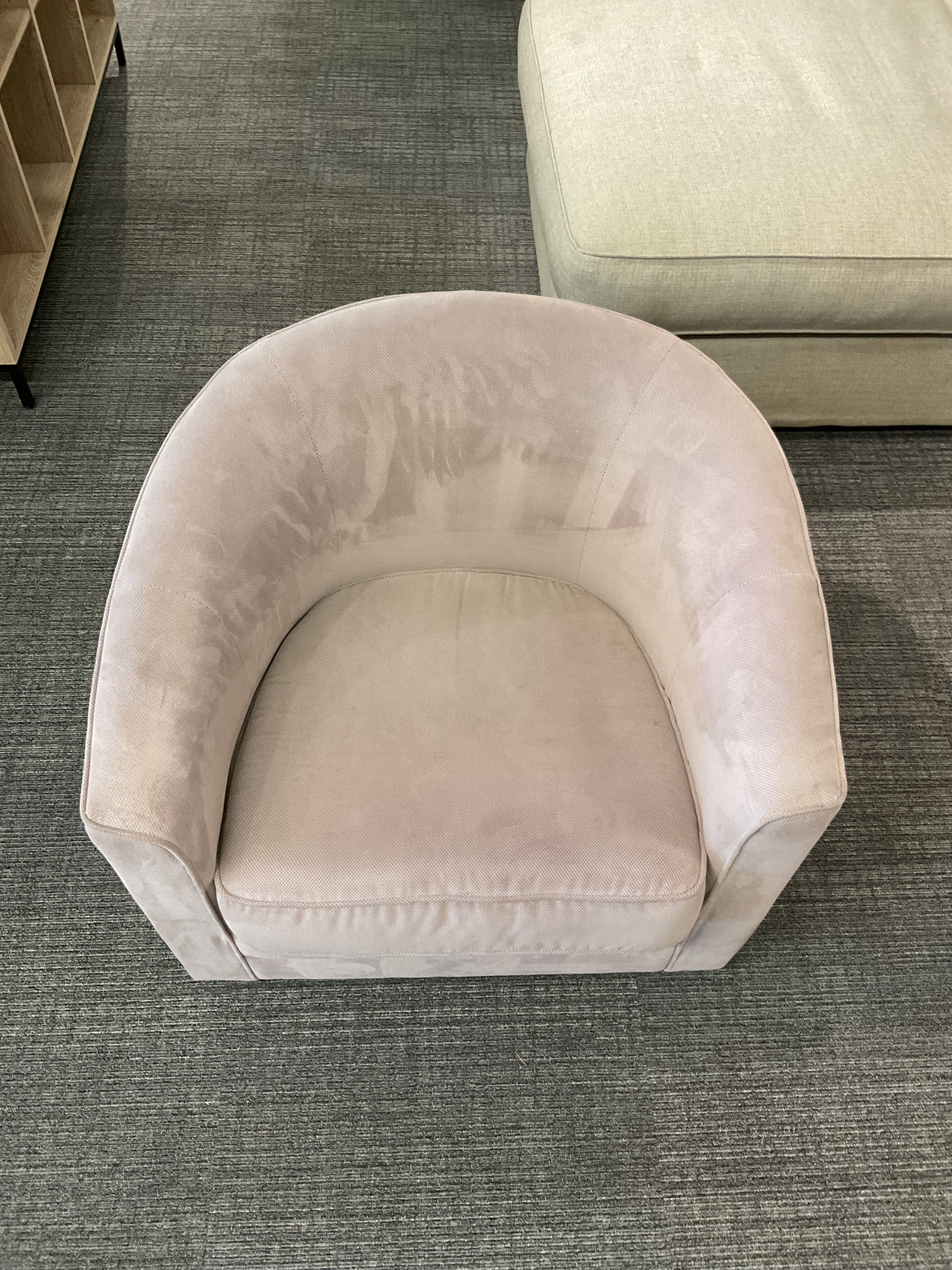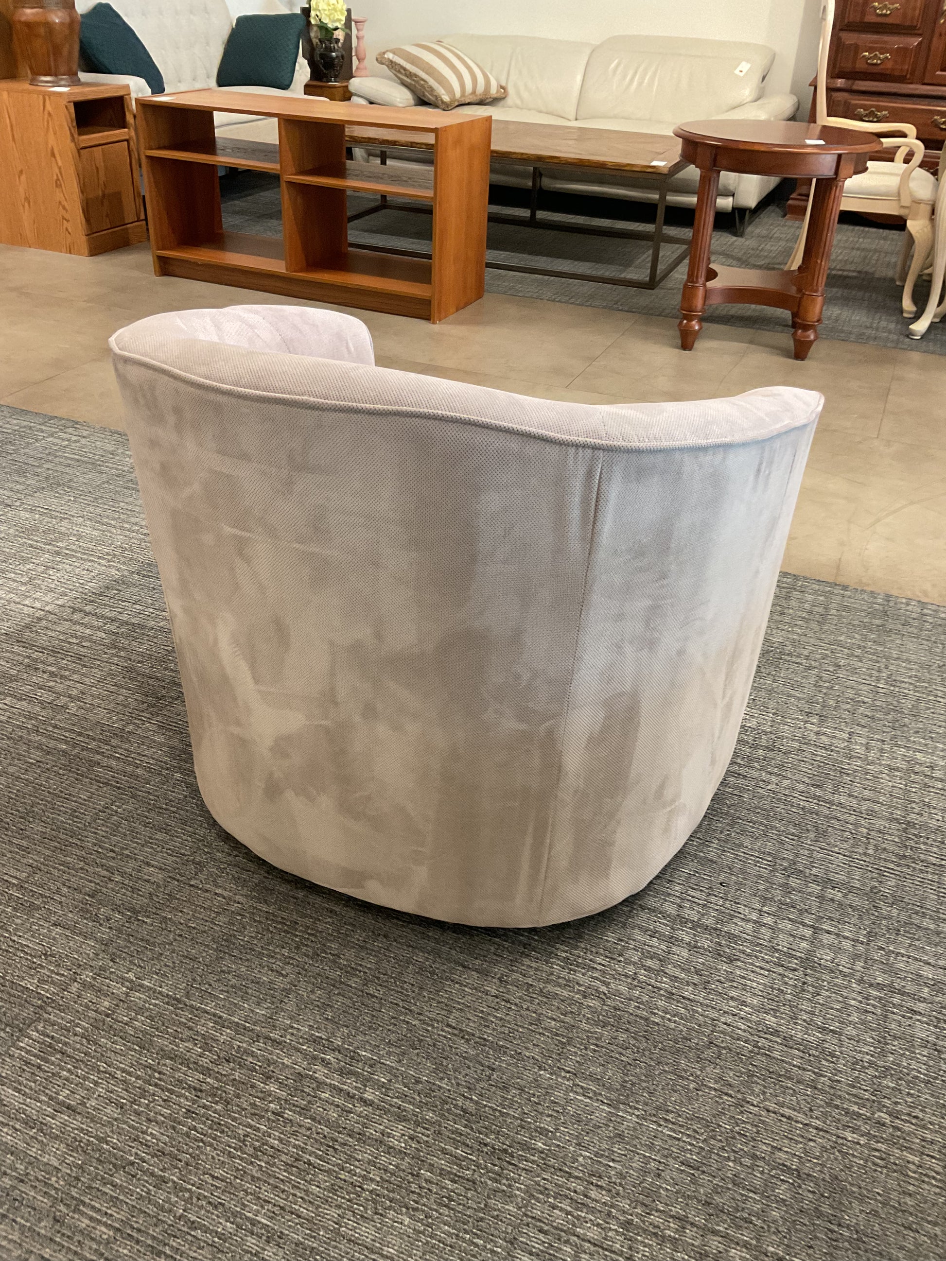 Comfy barrel armchair. Light beige/grey color, soft fabric. Curved back design, great for a cozy corner or accent piece. Chair has some discoloration, refer to photos for imperfections.