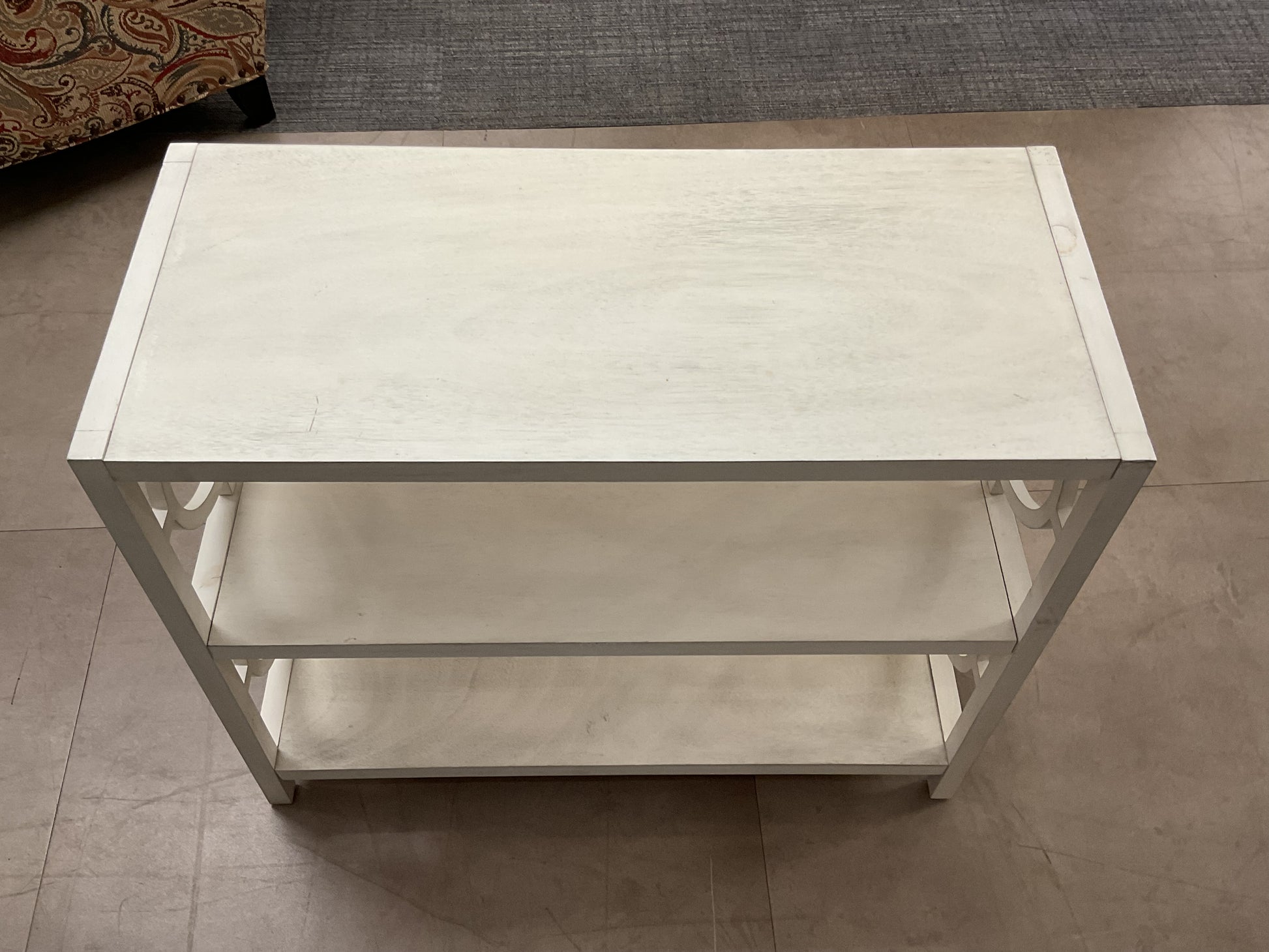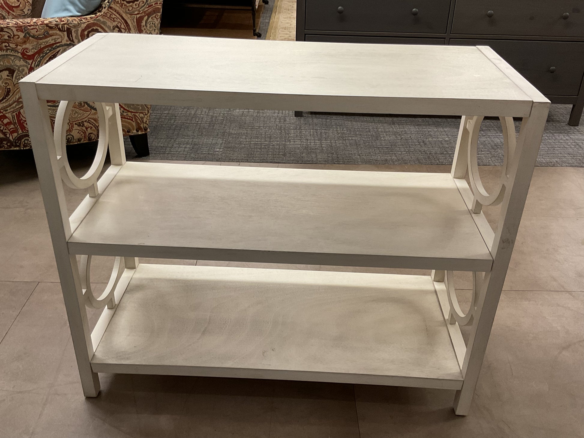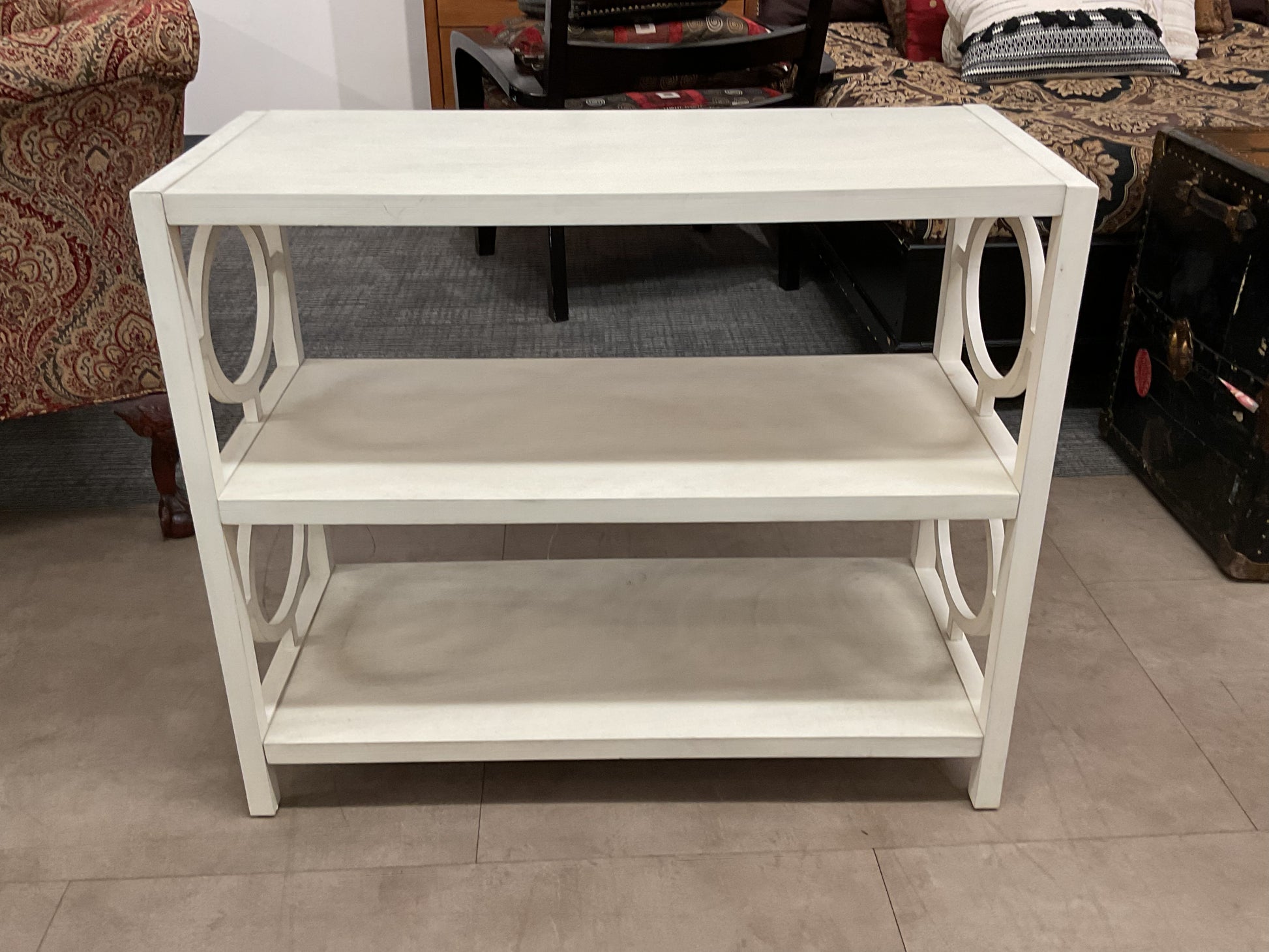 Features two shelves of open display for personal items. Brings a modern look to your home, the white opens and brightens.